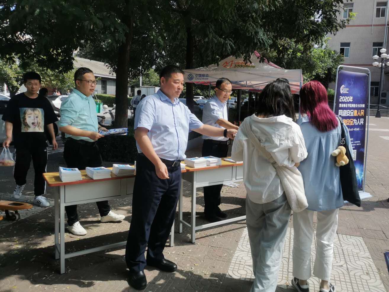 9月14日至20日是今年的国家网络安全宣传周。9月15日校园日当天,学校网络安全和信息化工作领导小组组长、党委书记卓宇在副校长曹强一行陪同下到宣传地点查看了网络安全知识宣传展板,听取了宣传周活动总体安排,并分发网络安全宣传彩页、网络法规书籍等。