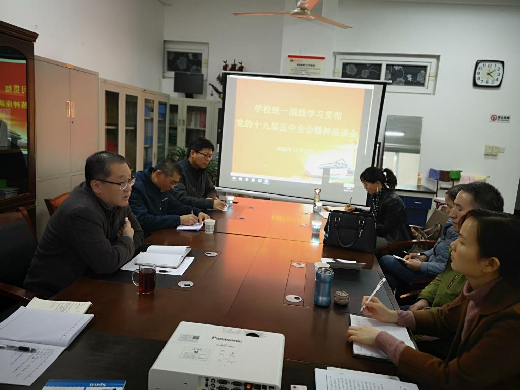 11月17日下午,学校召开统一战线座谈会,学习宣传党的十九届五中全会精神,安排部署统一战线贯彻落实党的十九届五中全会精神有关工作。学校各民主党派基层组织负责人、无党派代表人士参加会议。会议由统战部副部长杨利民主持。