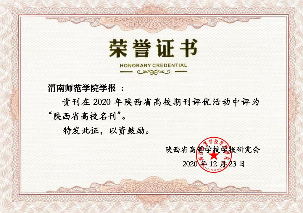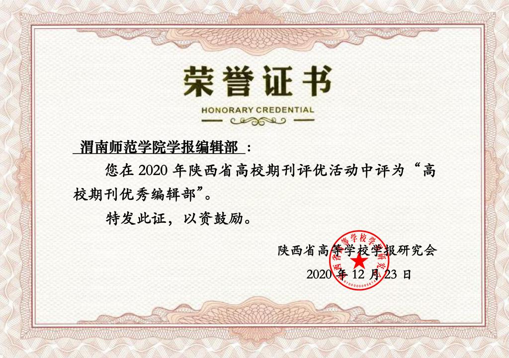 在2020年陕西省高校期刊评优活动中,best365《best365中国官方网站学报》荣获“陕西省高校名刊”称号,学报编辑部被评为“陕西省高校期刊优秀编辑部”。