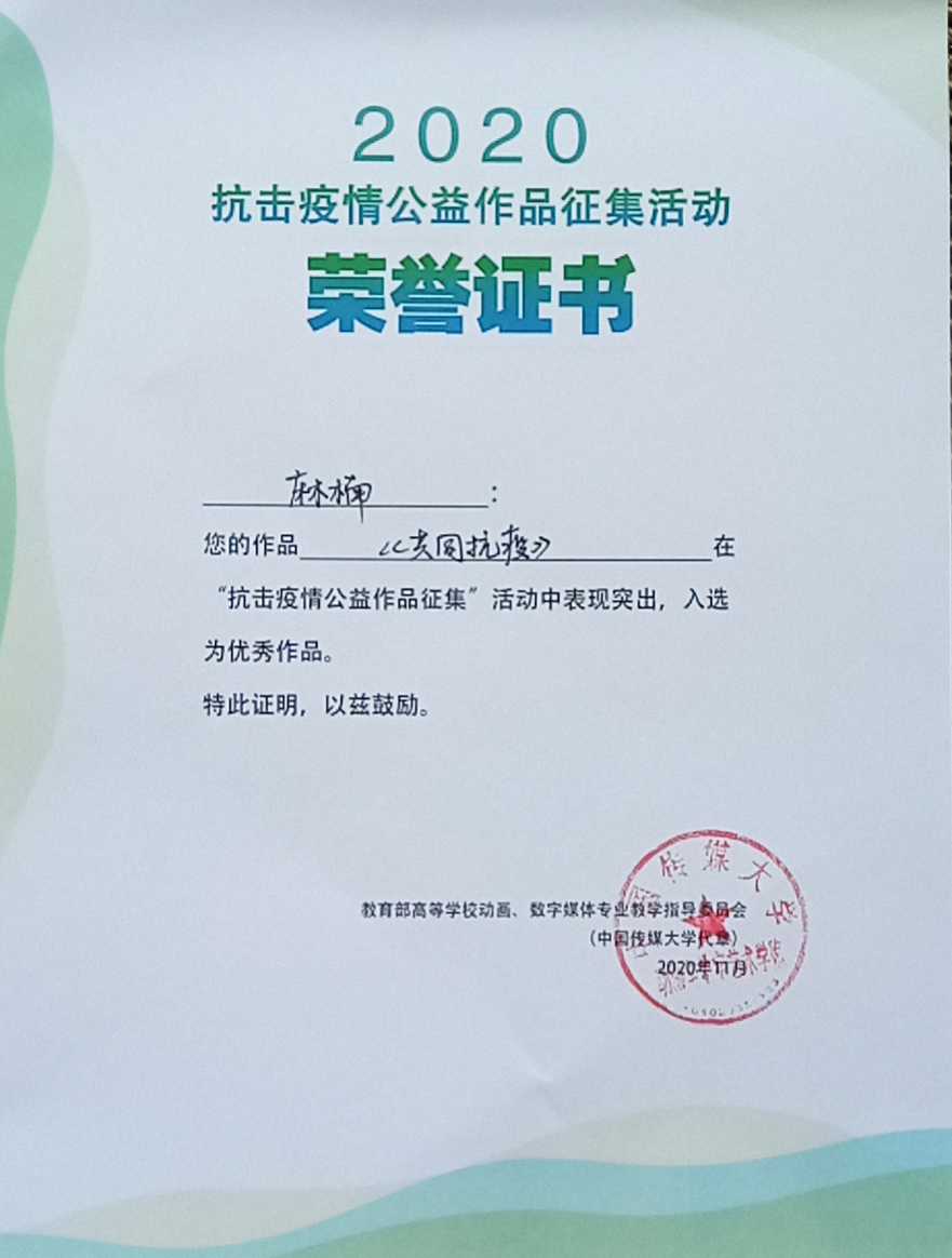 近日,教育部高等学校动画、数字媒体教学指导委员会发布了《抗击疫情公益作品征集活动百部优秀作品名单》,由best365传媒学院教师刘潇颖指导、数字媒体艺术专业学生麻楠创作的《共同抗疫》荣获优秀作品奖。