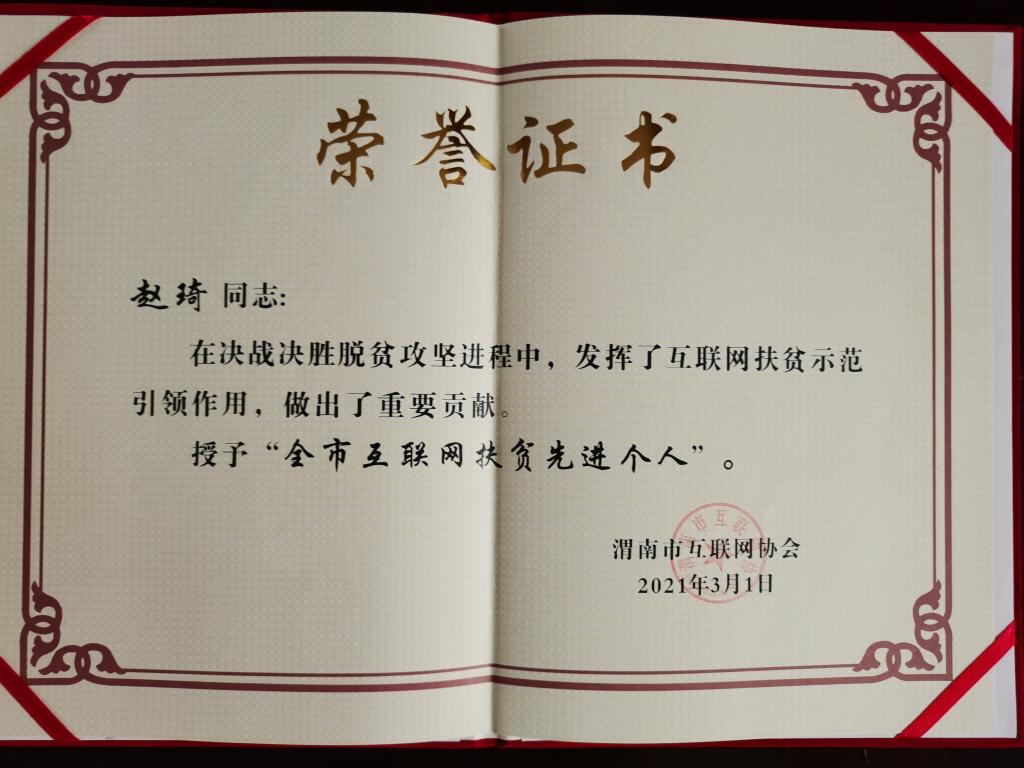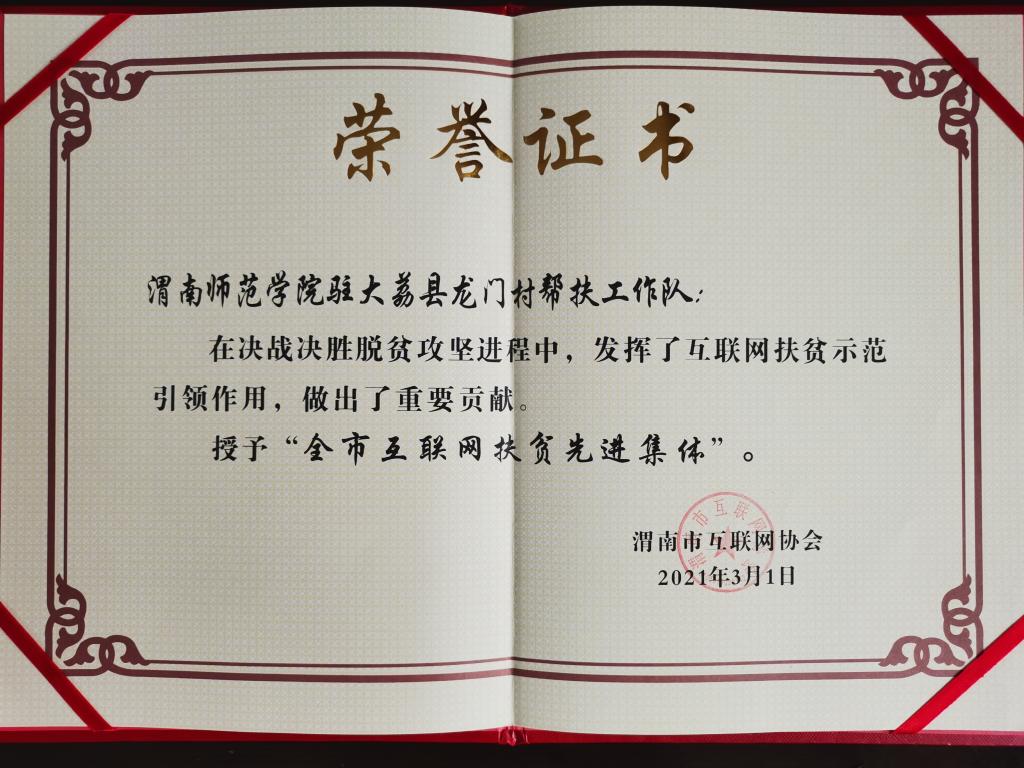 best365驻大荔县龙门村帮扶工作队还被渭南市互联网协会授予“全市互联网扶贫先进集体”,best365派驻大荔县龙门村第一书记赵琦被授予“全市互联网扶贫先进个人”。(通讯员 苟卫锋 赵琦)