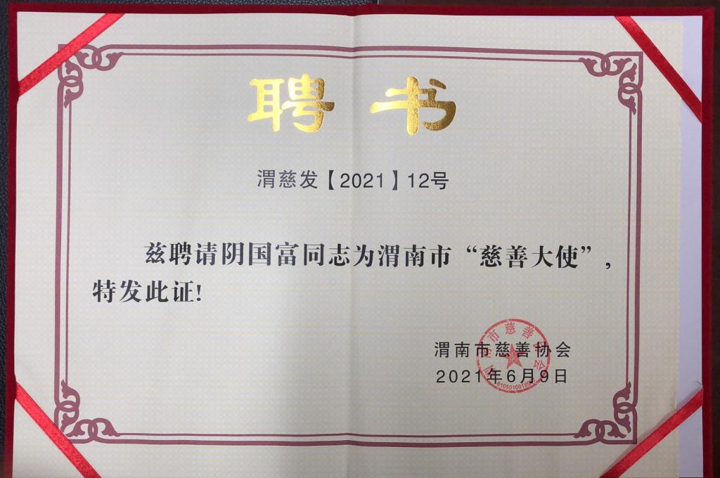 据悉,此次共有9名来自科技、教育、文化、产业等不同领域的优秀代表受聘为渭南市“慈善大使”。阴国富作为渭南市科技领域代表,长期热衷慈善事业,在新冠疫情防控、汶川地震捐助、贫困学子教育捐助、社会平台医疗捐助等公益事件中一直积极参与。(通讯员 吴晓艳 审核人 王建平)