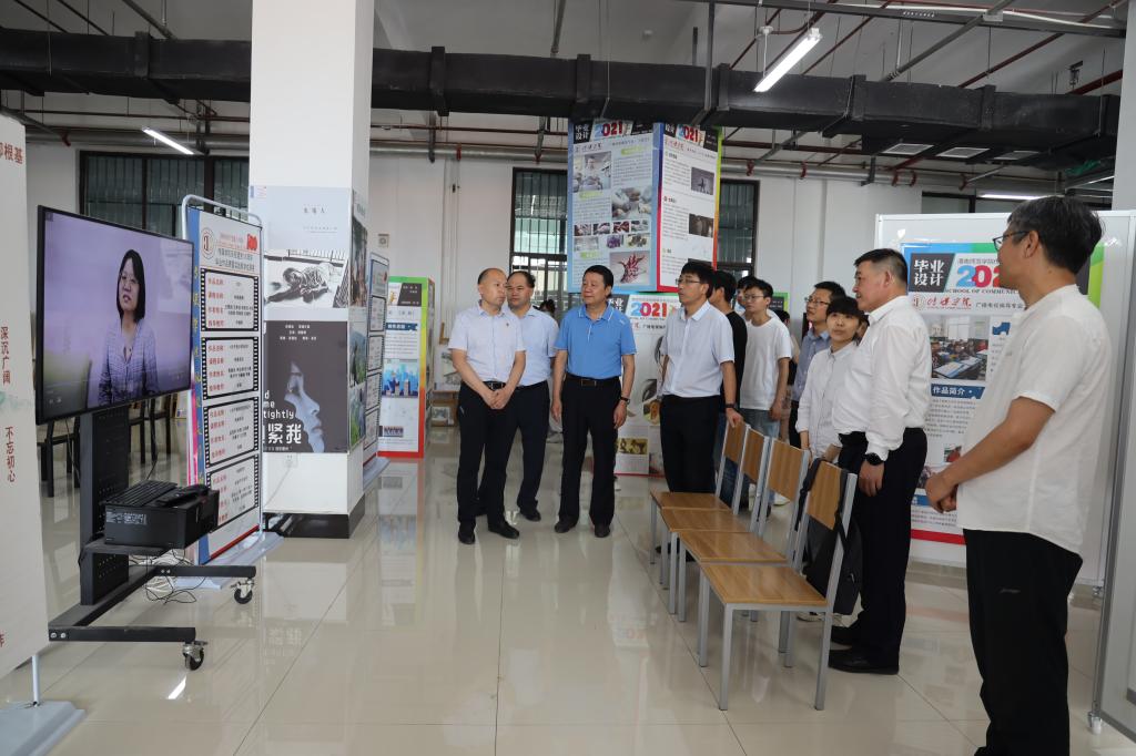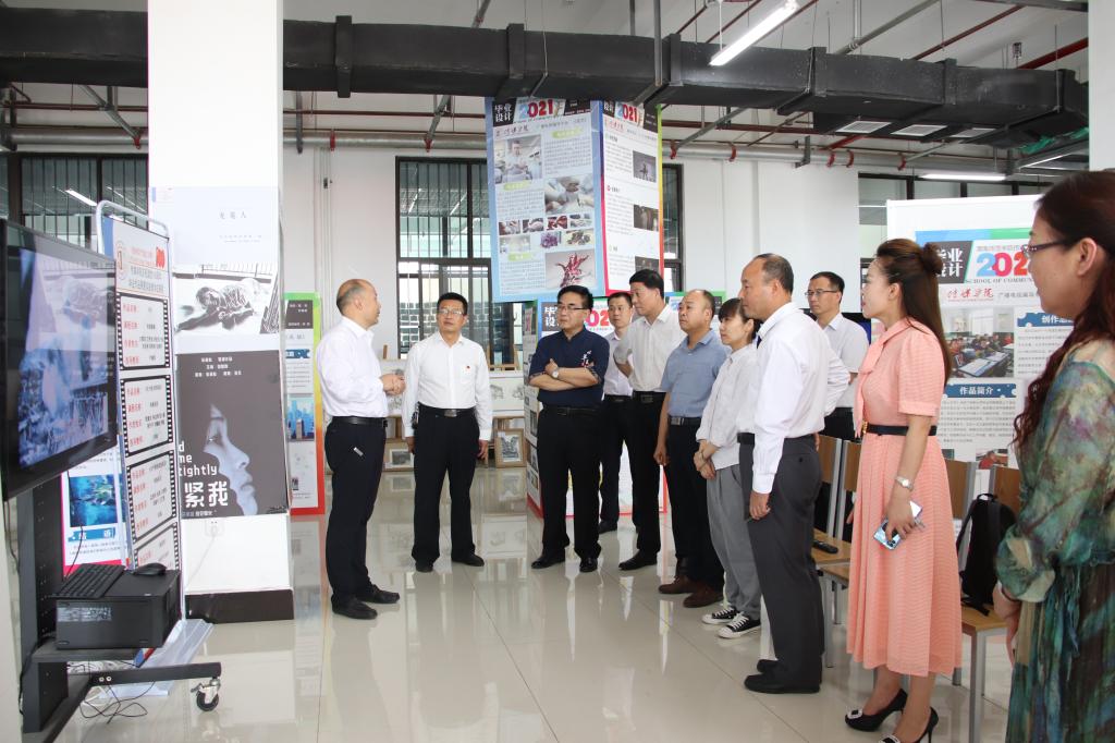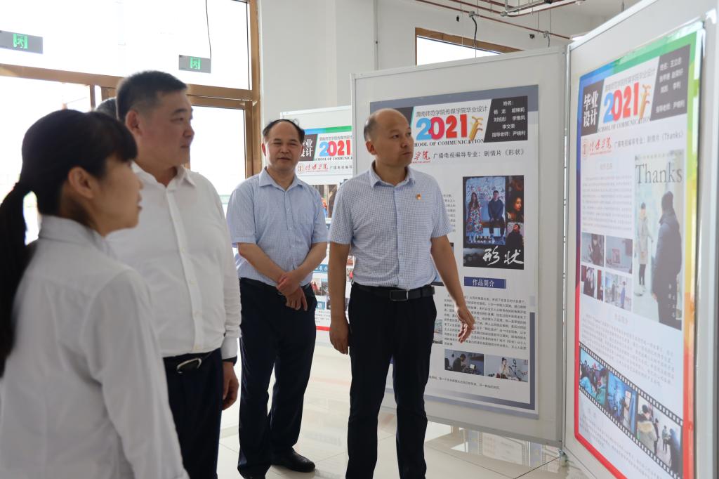 6月25日,党委书记卓宇、校长赵曼,党委副书记任健、纪委书记肖耀刚,副校长卢爱刚、王菊霞、韩小卫、常青林、曹强,党委委员、组织部部长凌朝栋,党委委员、宣传部部长李明敏一行到富平校区,参观指导传媒学院举办的庆祝建党一百周年主题暨2021年毕业作品与实践教学成果展。