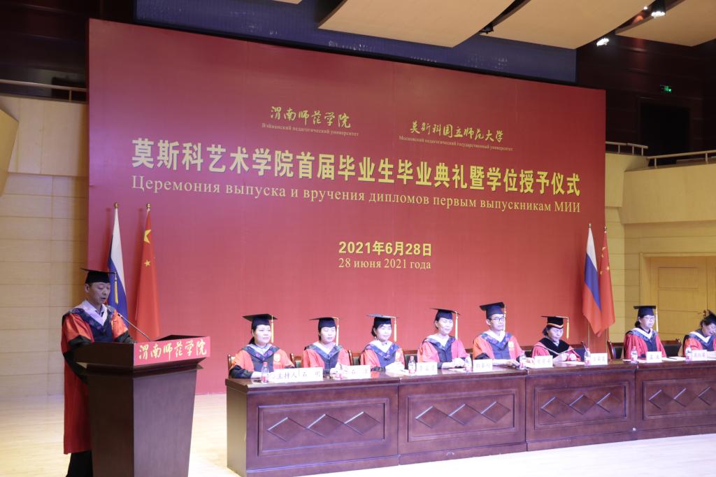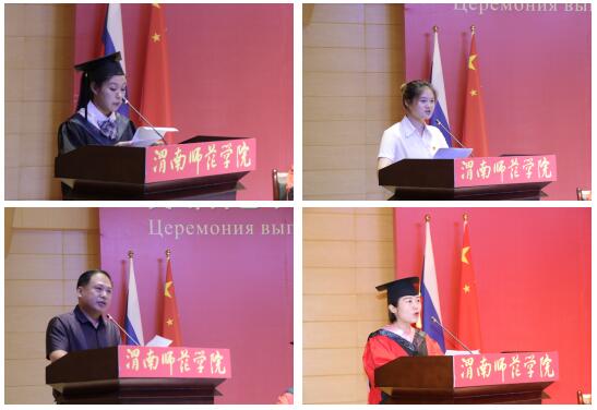 毕业典礼在庄严的国歌声中拉开序幕。俄罗斯莫斯科国立师范大学俄中统筹中心主任、莫斯科艺术学院俄方副校长尤金先生向毕业生在线致辞,祝贺大家顺利完成学业,并向即将赴莫斯科国立师范大学读研的67名学生表示欢迎,向为同学们成长成才呕心沥血、辛勤付出的老师表示衷心感谢,向含辛茹苦培养和支持同学们完成学业的家人致以崇高敬意。
