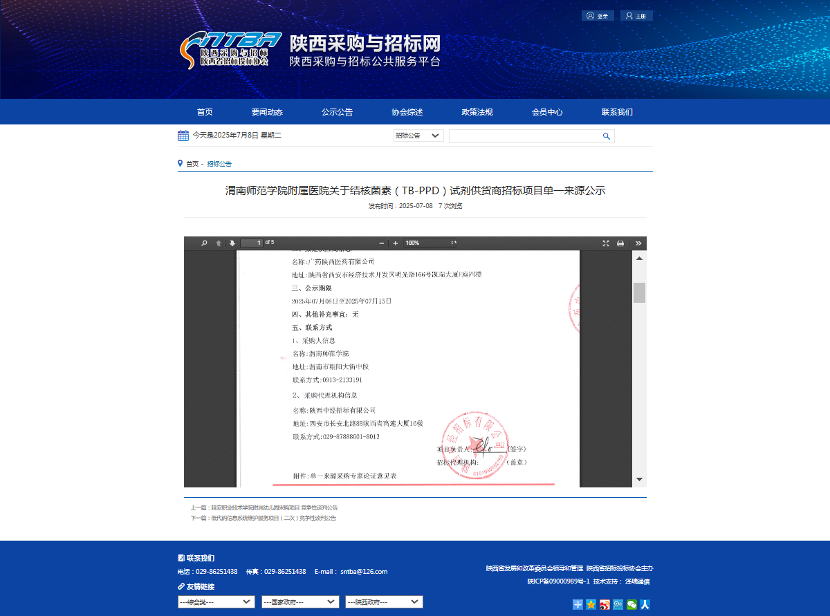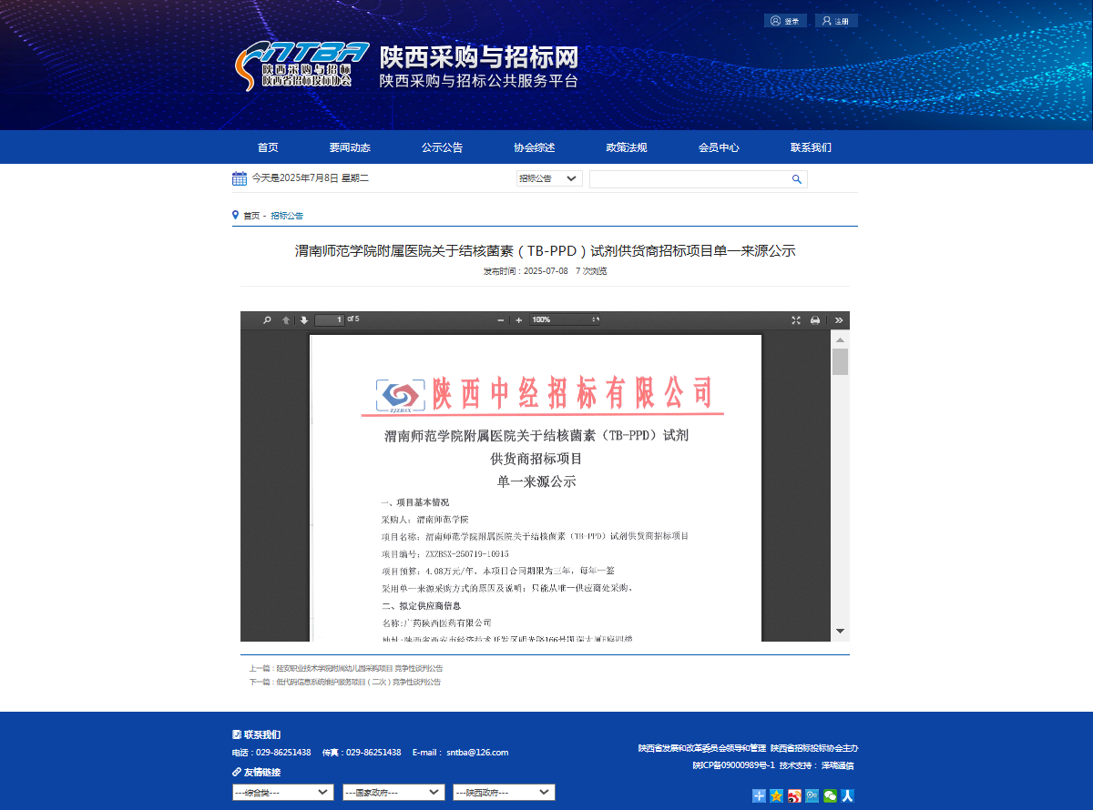 best365中国官方网站附属医院关于结核菌素(TB-PPD)试剂供货商招标项目单一来源公示