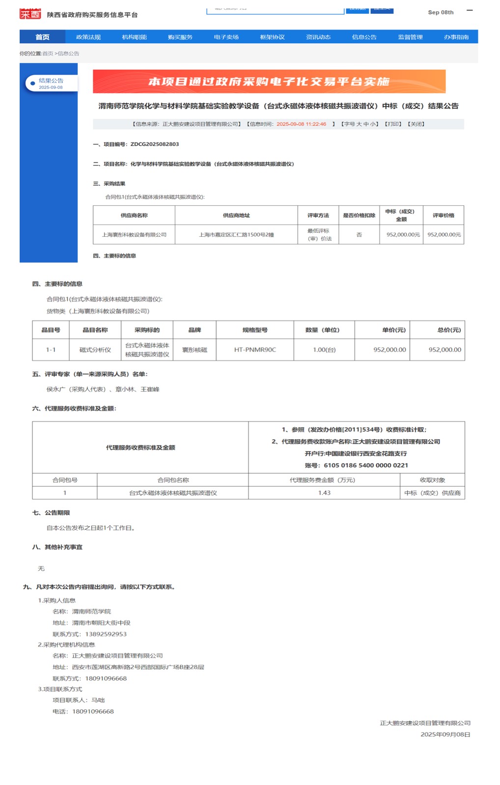 best365中国官方网站化学与材料学院基础实验教学设备(台式永磁体液体核磁共振波谱仪)中标(成交)结果公告