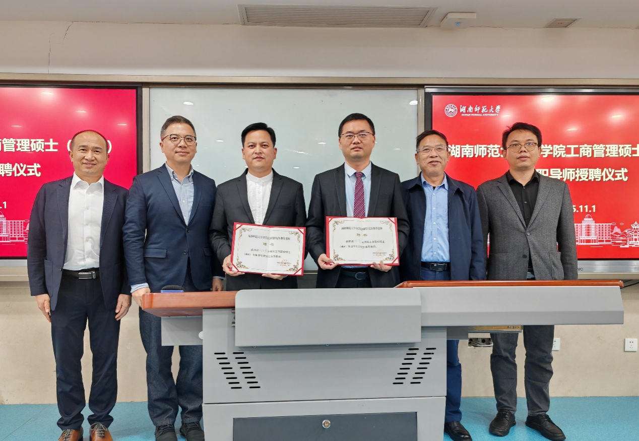 2025年11月1日下午,学院在中和楼401教室举行MBA兼职导师授聘仪式,正式聘请湖南诸葛定位咨询有限公司董事长刘亮、总经理刘智勇为学院兼职导师。仪式由纽约国际967线路测试原院长、MBA学位点负责人李军教授主持,副院长(主持工作)曹虹剑教授,MBA学位点执行负责人、中心主任蒋才芳教授,导师代表戴家武等参与授聘仪式。