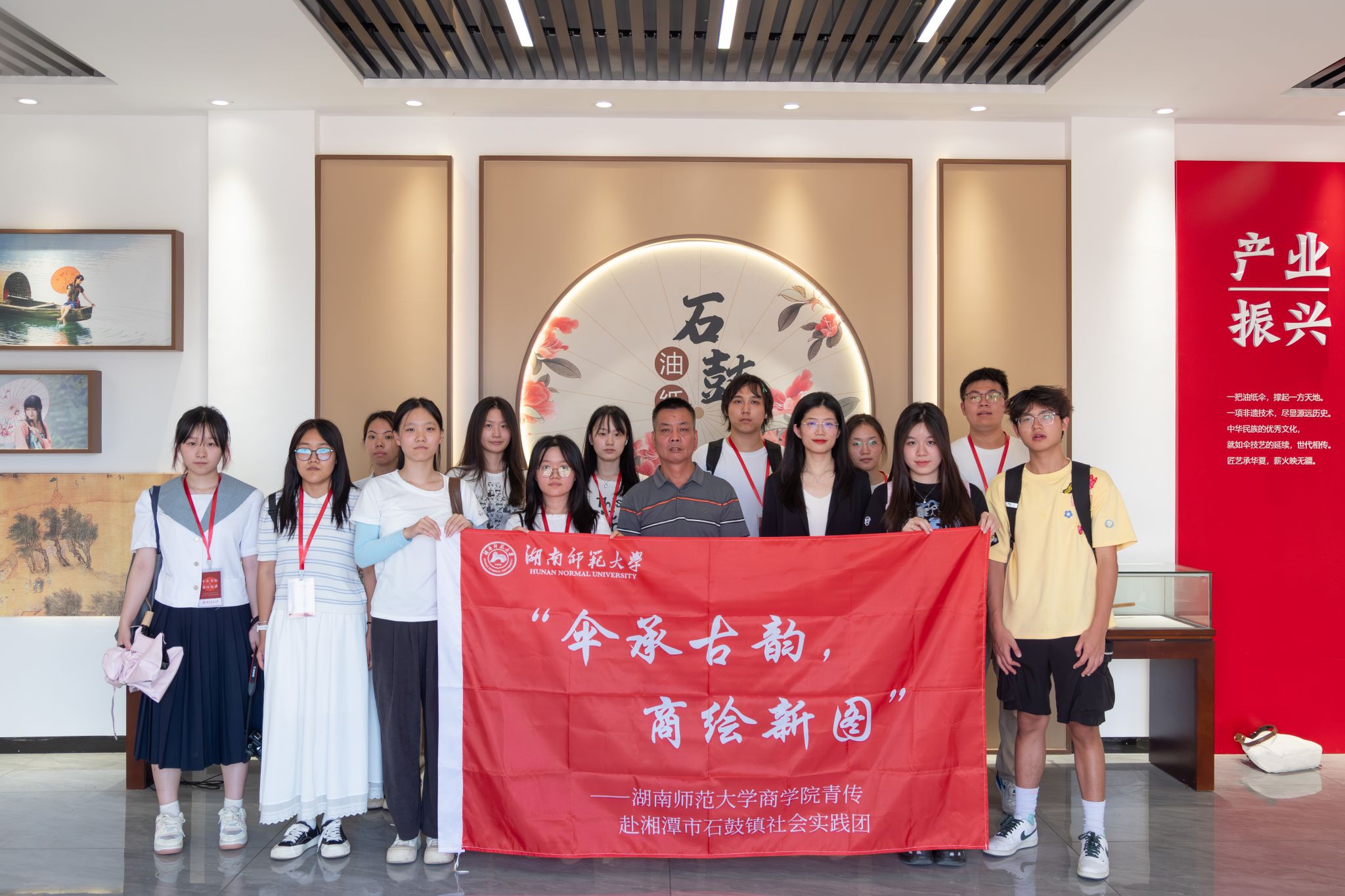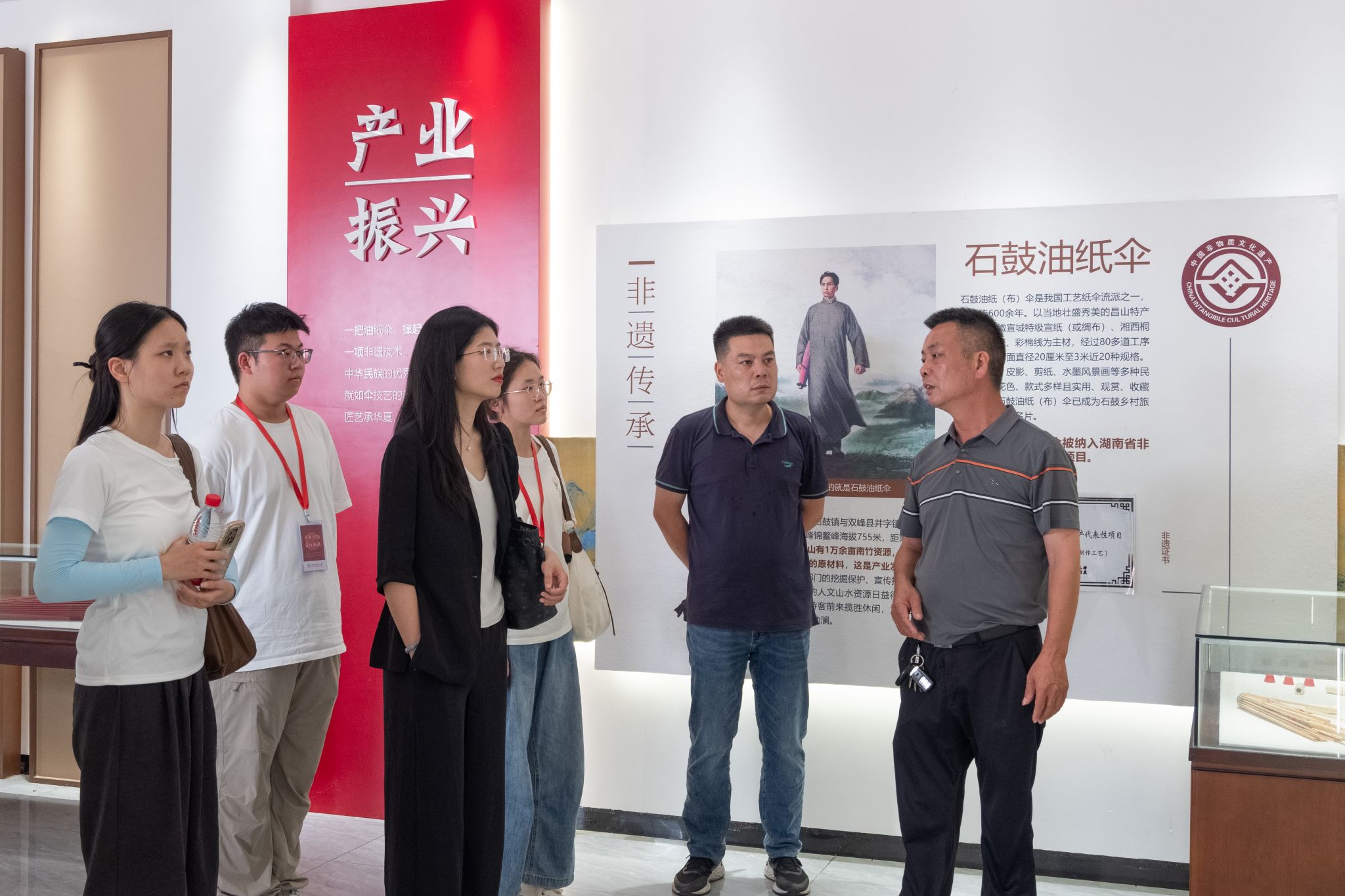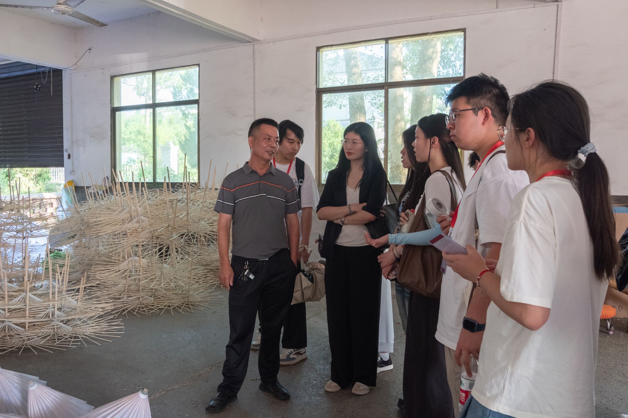 汤先阳带领实践团成员参观将军村石鼓油纸伞研学基地。他围绕石鼓油纸伞的历史起源、文化底蕴、产业振兴向实践团成员进行介绍,并通过展示具体数据反映石鼓油纸伞产业当前的规模。随后,实践团成员跟随汤先阳前往湘潭县竹宝工艺品有限公司参观调研,了解到企业生产加工流程与“批发+定制”的销售经营模式。文茜就企业外贸合作利润分配问题以及湘潭县石鼓油纸伞行业协会运行状况等进行提问,汤先阳对上述问题进行解答,并合影留念。