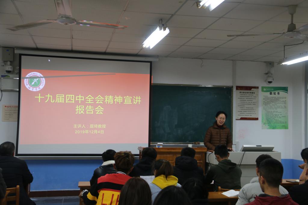 12月4日晚,体育学院于2421教室举办党的十九届四中全会精神宣讲报告会。本次报告会由马克思主义学院屈琦教授主讲。体育学院党总支副书记李春兰、团总支书记王斌、师生党员代表、入党积极分子代表以及学生代表一百三十余人聆听宣讲报告会。报告会由体育学院党总支书记田耿辉主持。