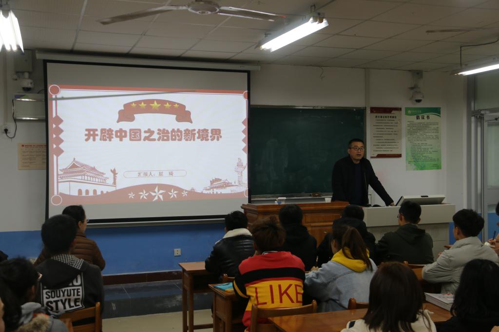 屈琦教授以“开辟中国之治的新境界”为题,围绕全会概况、重点内容、公报关键词解析、全会召开意义等4个方面,从“十八大以来历次全会核心内容”以及“全会重点内容4个一”“13个优势”“13个坚持和完善”“14个关键词”“3点重要意义”“大小三步走战略”等作为切入点,为师生详细解读了中国特色社会主义制度和国家治理体系的显著优势,阐述了十八大以来党和国家事业取得的重大成就,并对全会《决定》的总体要求、总体目标和重点任务等,进行了深入浅出、系统全面的解读。
