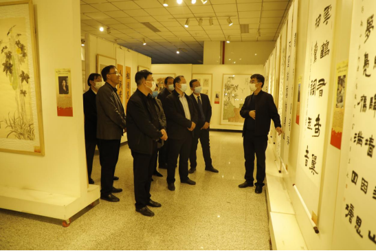 李军强一行首先参观了渭南市美协、书协与莫斯科艺术学院联合举办《喜迎二十大·永远跟党走·奋进新征程》主题书画展。他对参展作品选取陕西名山大川作为绘画题材表示赞赏,他指出,参展作品不论是轻“描”淡“写”还是浓墨重彩,均展现了陕西独特的自然风貌和厚重的文化底蕴,表现了渭南特有的“华山风骨,渭水襟怀”精神,既有传统韵味,又有时代内涵。 他勉励师生创作出更多优秀的作品,弘扬主旋律,讴歌新时代,担负起时代赋予的使命和责任。