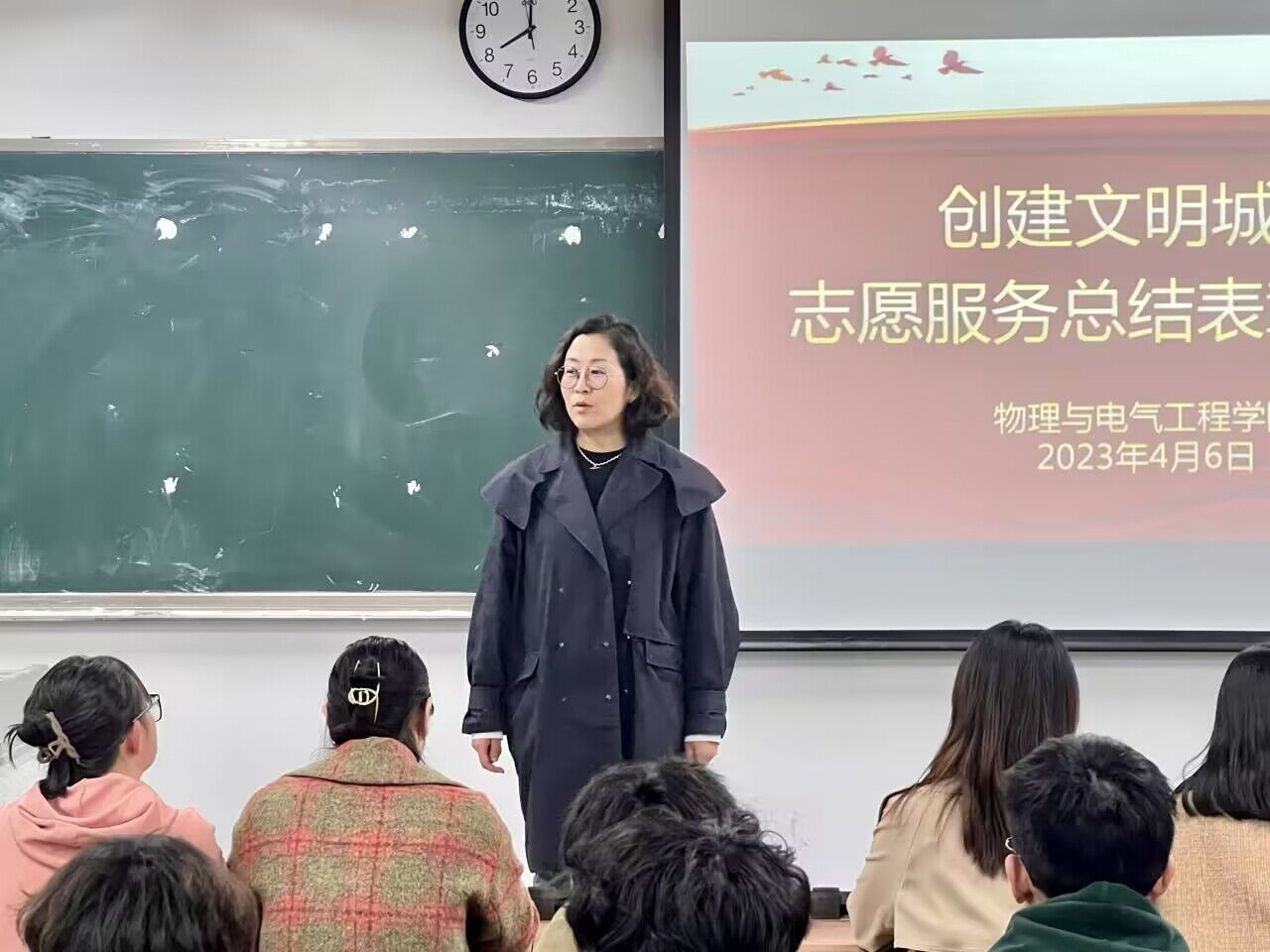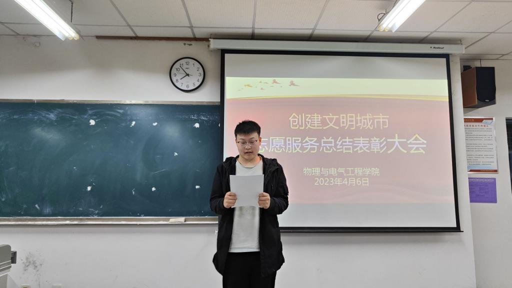 4月6日晚,物理与电气工程学院举办创建文明城市志愿服务总结表彰大会,对本次活动中涌现出的先进个人、优秀志愿者进行了表彰,激励全体学生积极投身志愿服务活动,在学院形成“我志愿 我服务 我参与”的志愿服务氛围。学院党总支副书记权轻舟、专职辅导员、受表彰同学及22级部分学生代表参会。