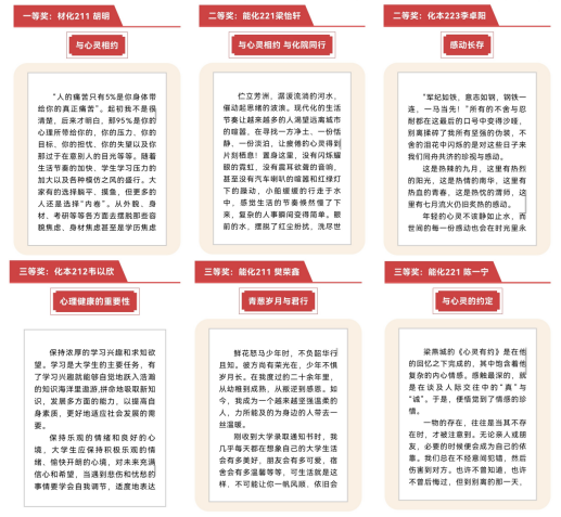 为深入学习贯彻党的二十大精神,进一步提高大学生心理健康素质,促进大学生的心理健康,宣传普及心理健康知识,日前,化学与材料学院特开展以“记录最美瞬间,促进心灵成长”为主题的心理健康教育系列活动。截至6月1日,为期一个季度的心理健康教育主题实践活动圆满结束,共计700余人参加活动,活动共评选出优秀作品30余件。