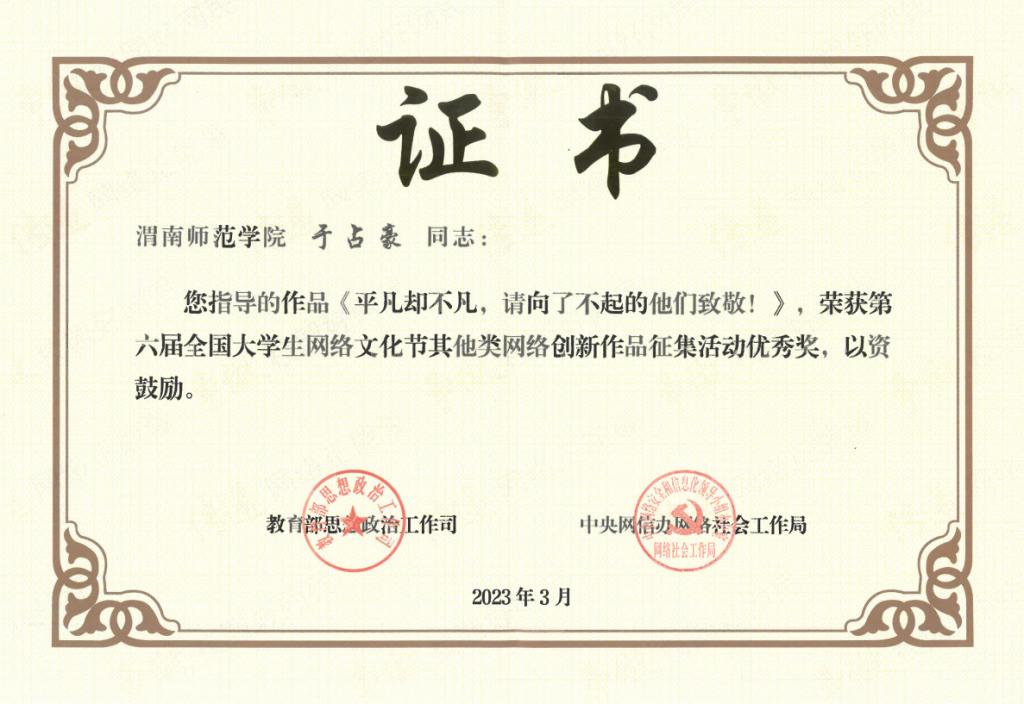 近日,在教育部思想政治工作司、中央网信办网络社会工作局联合主办的第六届全国大学生网络文化节活动中,best365官微推文参选作品《平凡却不凡,请向他们致敬》荣获“其他类网络创新作品”优秀奖,这是best365两次参加全国大学生网络文化节活动以来,首次荣获该类奖项。