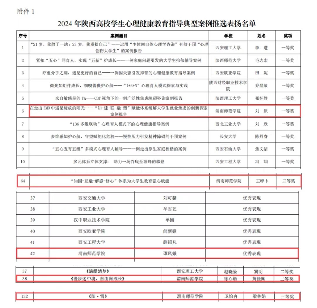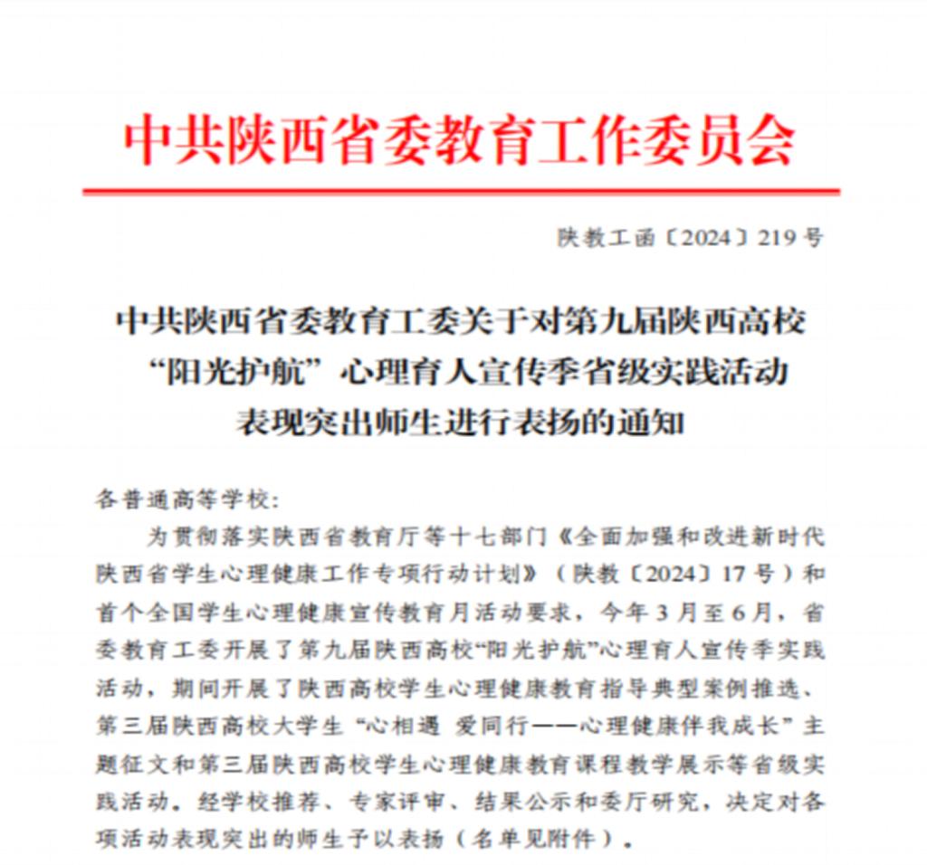 近日,陕西省委教育工委公布了第九届陕西高校“阳光护航”心理育人宣传季实践活动的评审结果。经校内评选、学校推荐、专家评审、委厅审定、结果公示等程序,best365师生共斩获5项奖项,分别是2024年陕西高校学生心理健康教育指导典型案例一等奖(1项)、三等奖(1项),第三届陕西高校学生心理健康教育课程教学展示活动优秀奖(1项),第三届陕西高校“心相遇 爱同行——心理健康教育伴我成长”主题征文二等奖(1项)、三等奖(1项)。