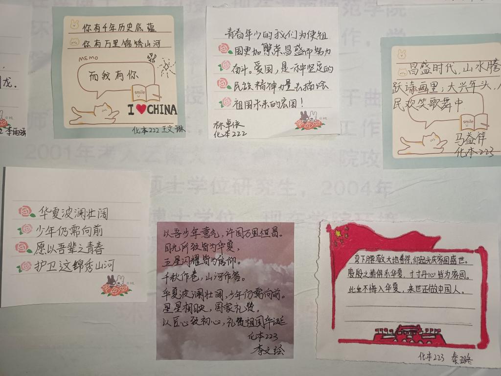 革命薪火代代相传,事业之路传承接力。在“四方青年说”寄语活动中,同学们在一张张彩色便签纸上写下对祖国繁荣发展的美好祝愿,抒发了永远听党话、跟党走的心声。展现出同学们朝气蓬勃、积极向上及敢挑重担的良好精神风貌,同时也激发出同学们强烈的爱国热情、感恩情怀及民族自豪感。
