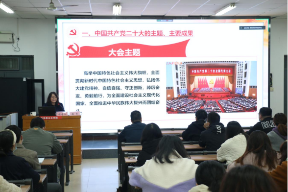 张萍从党的二十大主题、主要成果和报告起草过程,过去5年的工作和新时代10年的伟大变革,马克思主义中国化时代化,中国式现代化,全面建设社会主义现代化国家的目标任务,坚持党的全面领导和全面从严治党、应对风险挑战,教育、科技、人才工作的部署,教育系统学习宣传贯彻党的二十大精神的要求等七方面作了全面宣讲和深入阐释。