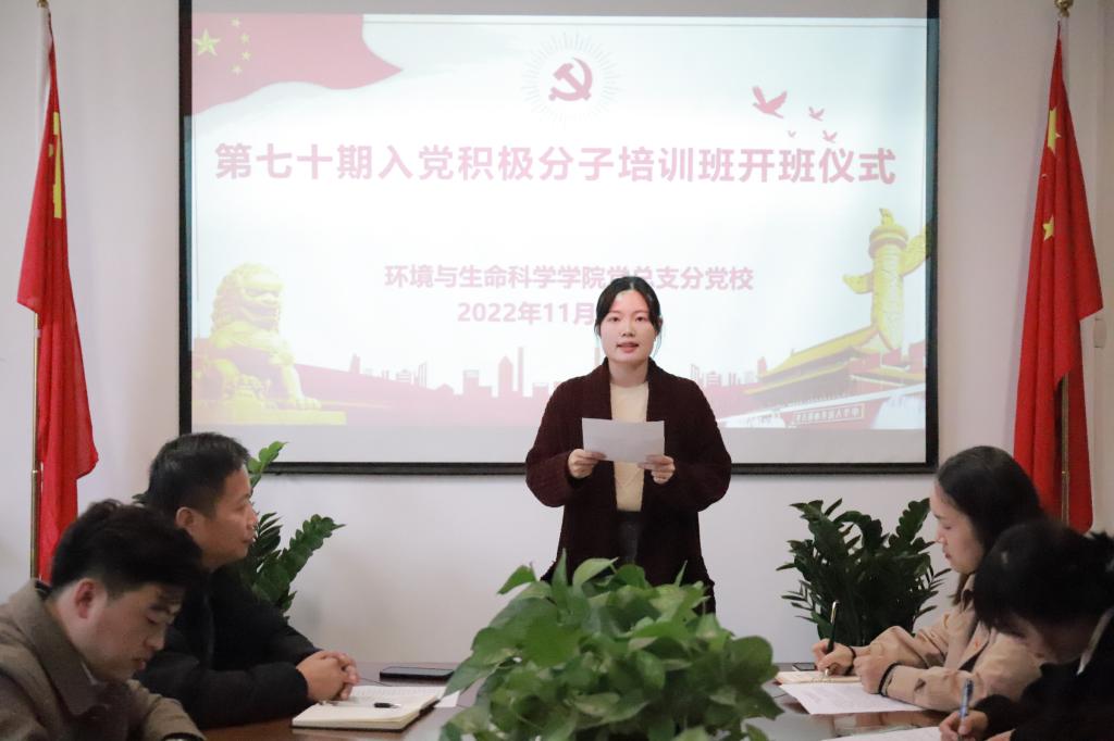 11月17日,环境与生命科学学院党总支分党校第七十期入党积极分子培训班开班仪式在学院会议室举行。分党校副校长、学院党总支副书记刘龙飞,分党校校务委员及40名入党积极分子参加了开班仪式,仪式由党总支秘书冯雨主持。