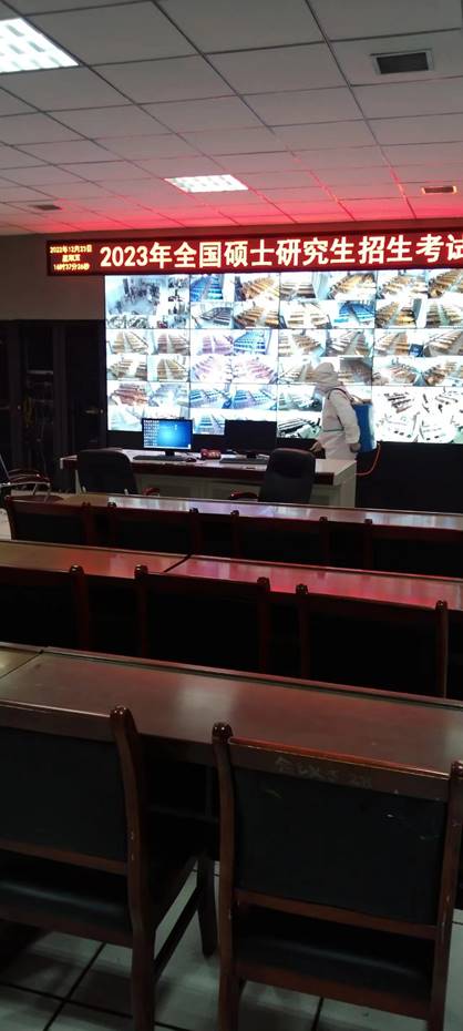 为考生提供一个安全放心的考试环境。按照学校疫情防控工作要求,物业管理科成立三个消杀组对学校考场、试题库、考务办公室等公共区域全面进行消杀,特别对隔离考场进行严格消杀,确保考试平稳、有序进行。楼宇保洁组提前维修损坏桌椅,负责各考场教室卫生,做到室内地面整洁,黑板无字迹,桌面干净,抽屉内无杂物,楼梯、楼道整洁卫生。负责完成了各考场外的警戒线、警示牌的布置等工作。电力保障组,联系渭南供电局提前安排专人对考试用电保供进行桌面推演,对考试区域线路进行巡查检修,考试期间派人在岗位进行值守保电。