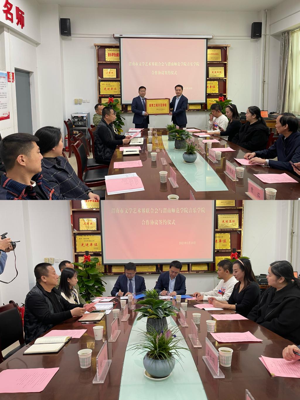 3月10日上午,音乐学院与渭南市文学艺术界联合会举行合作签约仪式。渭南市文学艺术界联合会主席张力、渭南市文学艺术界联合会副主席葛长明,best365中国官方网站音乐学院院长刘鹏、副院长逯克刚以及渭南市音协、舞协和师生代表参加此了次活动。
