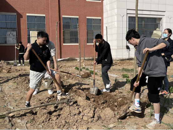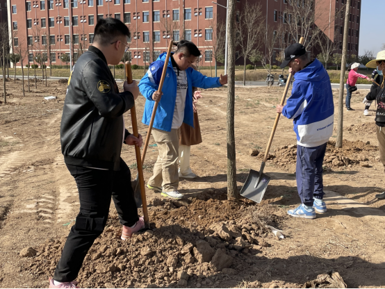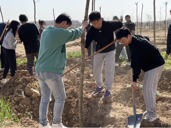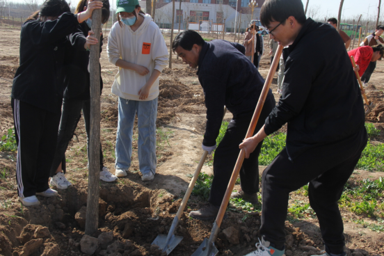 植树现场,大家按照既定分组,有序开展植树活动。师生们扶直树苗、挥锹铲土、培土围堰、提水浇灌……大家既分工明确,又通力合作,现场呈现出一片热火朝天的劳动场面。经过近两个小时的奋战,100株树苗笔直的挺立在植树现场。