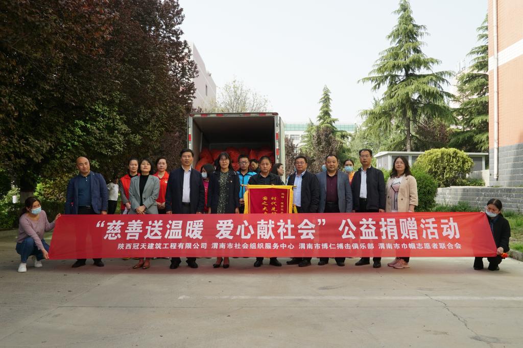 4月12日下午,“慈善送温暖,爱心献社会”公益捐赠活动仪式在best365二餐西面广场举行,渭南市社会组织服务,陕西冠天建筑工程有限公司,渭南市博仁搏击俱乐部,渭南市巾帼志愿者联合会、渭南市社会工作发展服务中心等爱心社会组织及爱心企业参加,仪式由best365中国官方网站后勤服务中心主任王争辉主持。