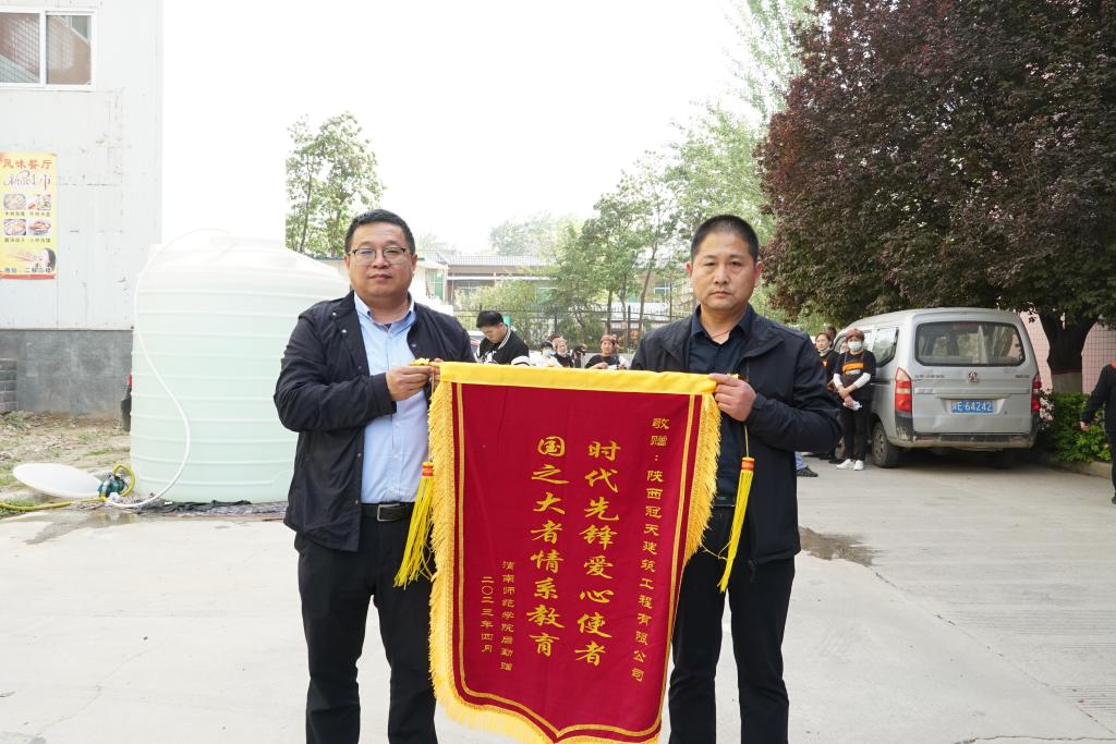 爱心捐赠企业陕西冠天建筑工程有限公司负责人王斌作了发言,他表示“上下同欲者胜,风雨同舟者兴”,并祝愿学校越办越好,桃李满天下。活动最后,由best365后勤服务中心党总支书记邹朋波为爱心企业授锦旗,并集体合影留念记录下这一美好时刻。