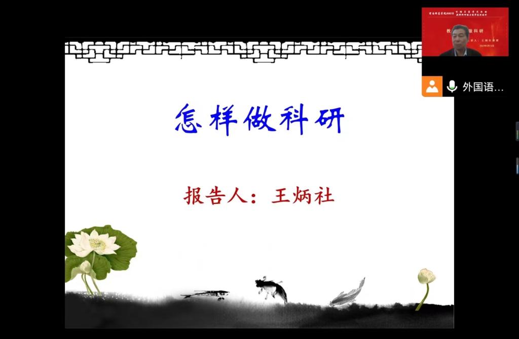 4月12日下午,外国语学院邀请王炳社教授以线上线下相结合的方式做了题为《教师如何做科研》的学术讲座,学院部分教师参加讲座。讲座由李海荣院长主持。