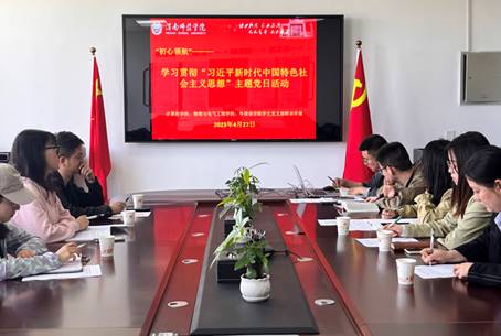 4月27日上午,计算机学院师生融合第一和第二党支部、物理与电气工程学院第三党支部、外国语学院学生第一和第二党支部在同心楼5406会议室联合开展“习近平新时代中国特色社会主义思想”主题联学活动,计算机学院师生融合第一党支部书记李雷玮、第二党支部书记薛飞、物理与电气工程学院第三党支部书记陈晨、支部委员张静雯、李雪荣、外国语学院学生第一党支部书记伍萌、第二党支部书记李萍以及各支部学生党员代表共计30余人参会,会议由计算机学院师生融合第二党支部书记薛飞主持。