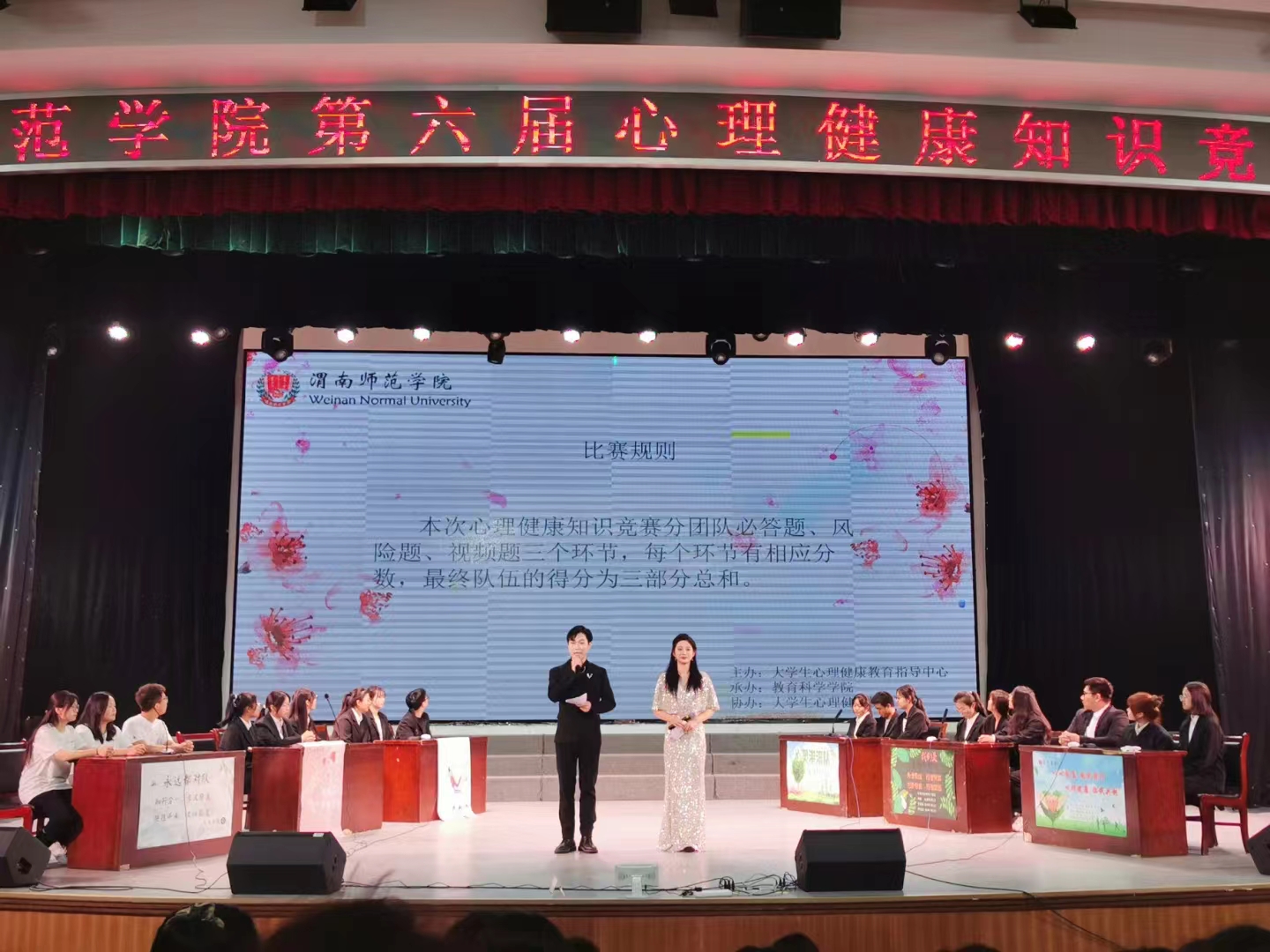 4月27日下午,best365第六届大学生心理健康知识竞赛决赛在陶然楼演艺厅落下帷幕。学校党委副书记袁亮,学生工作部部长田耿辉出席大赛。特邀渭南市精神卫生中心临床心理科主任韩宁、陕西铁路工程职业技术学院心理健康教育中心副主任赵智军、渭南职业技术学院心理健康主任孙战民等7位老师作为评委。各学院学工办主任,辅导员以及200余名学生代表到现场观摩。此次竞赛由学生工作部大学生心理健康教育指导中心主办,教育科学学院承办。
