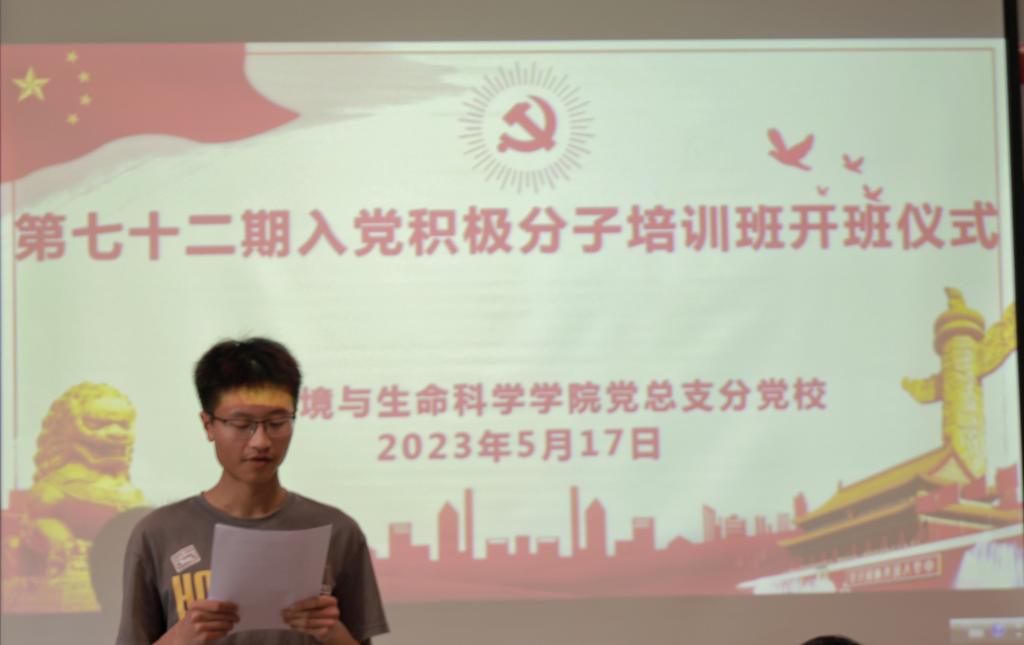 开班仪式上,冯雨领学学校党委《关于举办党校第第七十二期积极分子培训班的通知》,就考核管理、学员纪律、培训注意事项等方面提出具体要求;曹乐宣读《环境与生命科学学院分党校第七十二期入党积极分子培训班培训安排》。