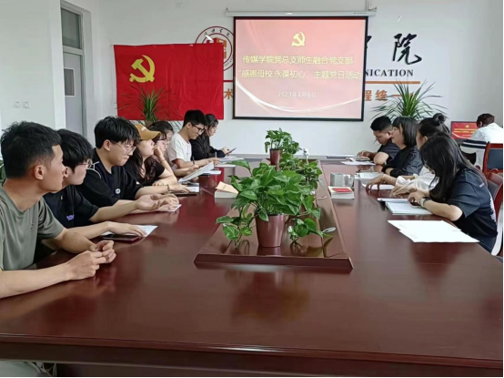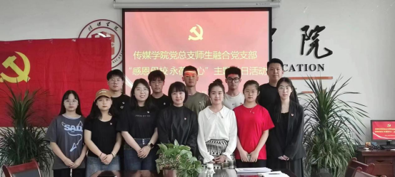 6月6日下午,传媒学院党总支师生融合党支部组织开展"感恩母校 永葆初心"主题党日活动。学院党总支副书记周双、支部全体教师党员以及2019级毕业生党员参加本次活动。