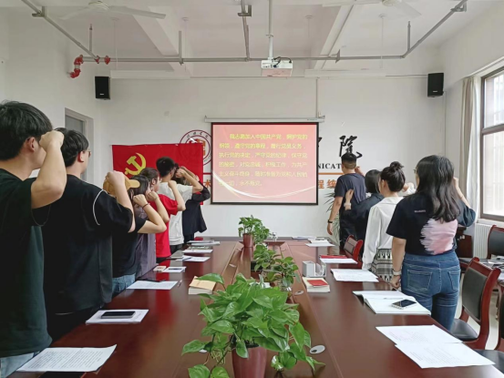 活动开始,全体党员起立齐唱《中华人民共和国国歌》,在毕业生党员代表交流分享环节,毕业生党员孟星星等逐个分享各自的入党初心,回顾了自己的大学生活,分享了自己一路走来的成长和改变,郑重的感谢母校的培养,感谢老师的教导。表示作为一名青年党员,要始终严格要求自己,要强化自身爱国力行的使命感,以更有担当的作为、更加饱满的精神、更为昂扬的斗志投入到新的工作中去,坚持做好先锋模范带头作用。随后,在学生党员杨韶烨带领下全体党员重温入党誓词,面对鲜红的党旗,全体党员高举右拳庄严宣誓,铿锵恢弘誓词,强烈震撼着每一个党员。