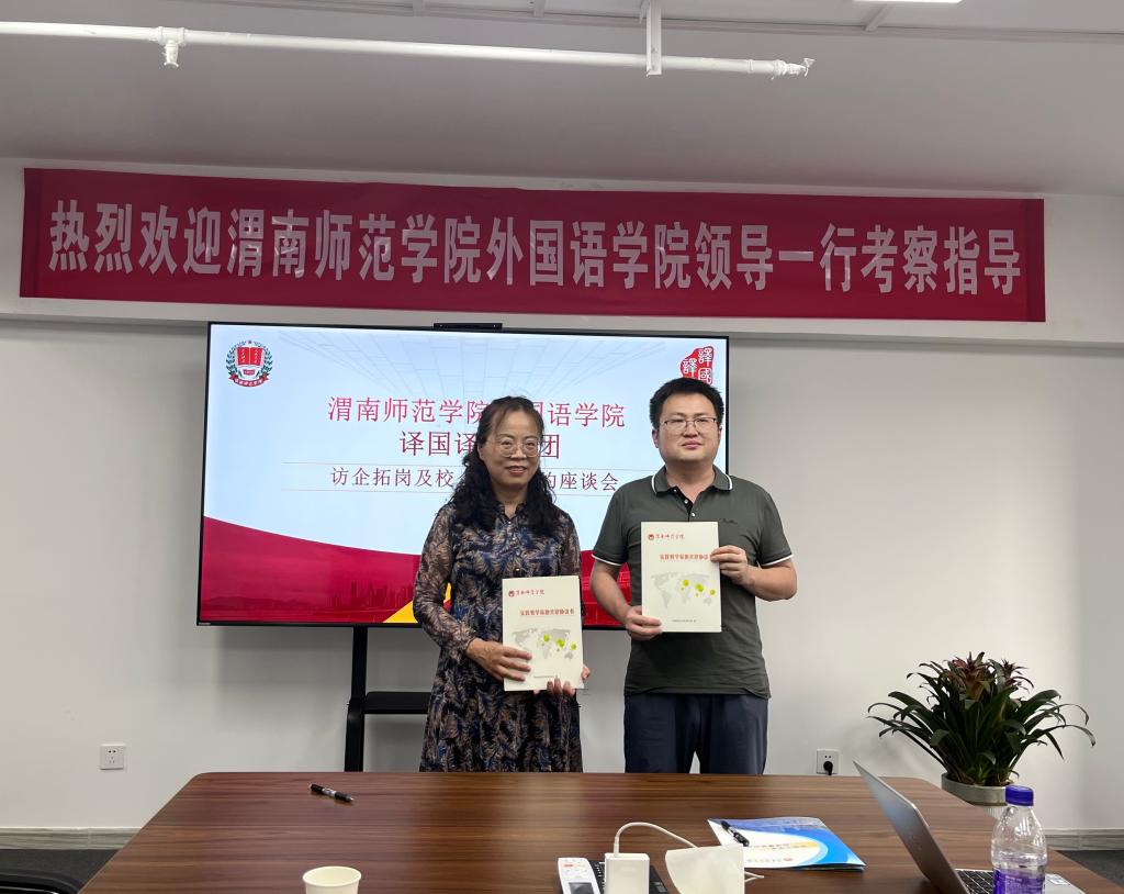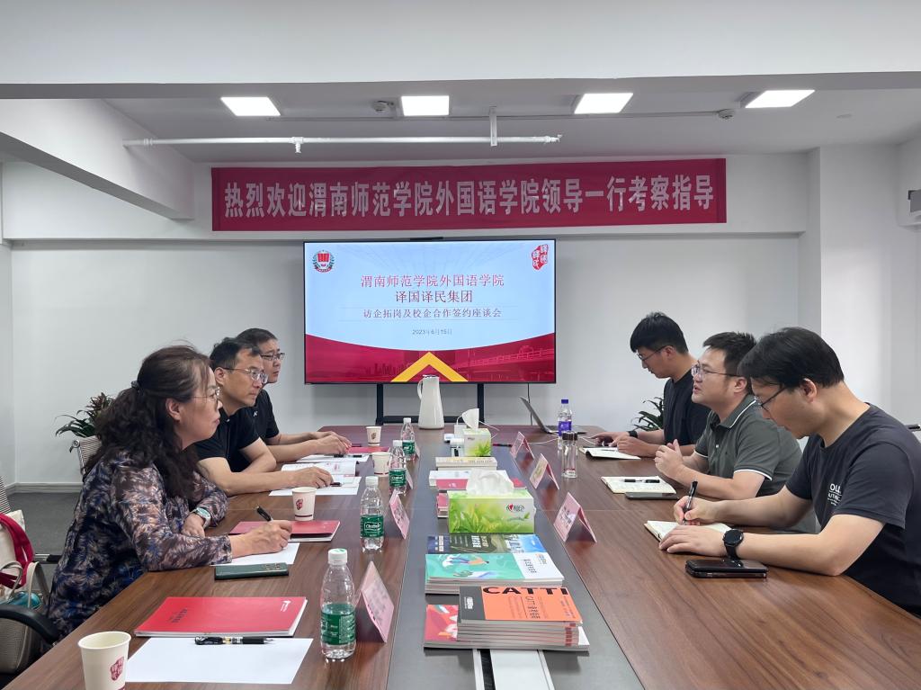 译国译民集团西安分公司商务总监张博、商务总监沈海涛、考研市场经理邵孝魁对我院一行人的来访表示热烈欢迎。张博介绍了集团的发展过程及当前主营业务,并详细介绍了集团在翻译服务、职场翻译培训、CATTI考试培训、翻译师资培训、课程建设、翻译实践及翻译实验室建设等方面的优势业务。双方还就教师发展、翻译实验室建设规划、翻译专业学生见习实习、翻译译著合作出版等方面进行了深入探讨。