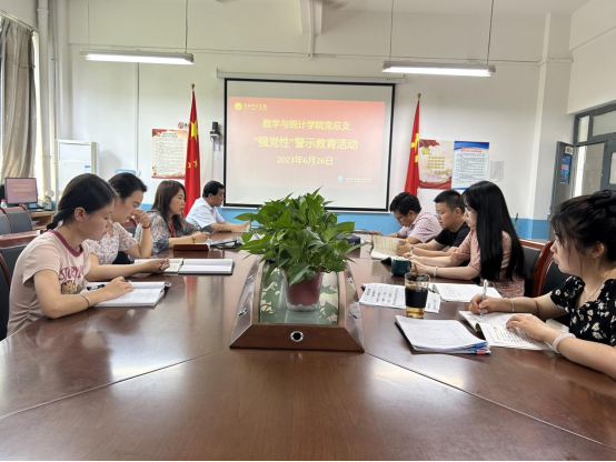 6月26日,数学与统计学院党总支在学院会议室开展“强党性”警示教育活动,学院领导干部和全体行政人员参加,学院党总支书记武江波主持会议。