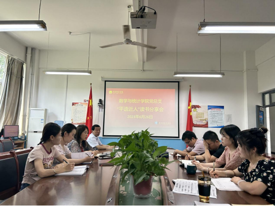6月26日,数学与统计学院党总支在学院会议室召开“平语近人”读书分享会,学院领导干部和全体行政人员参加,学院党总支书记武江波主持会议。