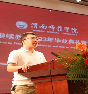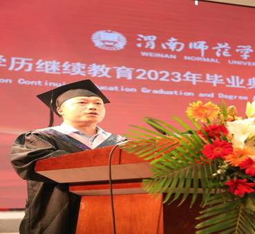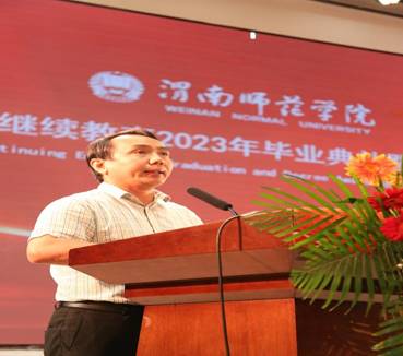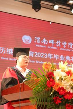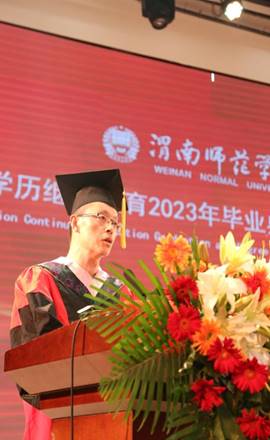 王菊霞致辞,她代表学校向圆满完成学业的毕业生致以热烈的祝贺,向为毕业生成长成才辛劳付出的老师和家属们表示衷心感谢和崇高敬意。在毕业生即将踏上新征程之际,她对大家提出三点希望:一是养成终身学习的习惯;二是永葆“敢于担当,勇于创新”的责任心;三是在人生的新起点上,践行渭师“天天奋斗,天天快乐”的学校精神。