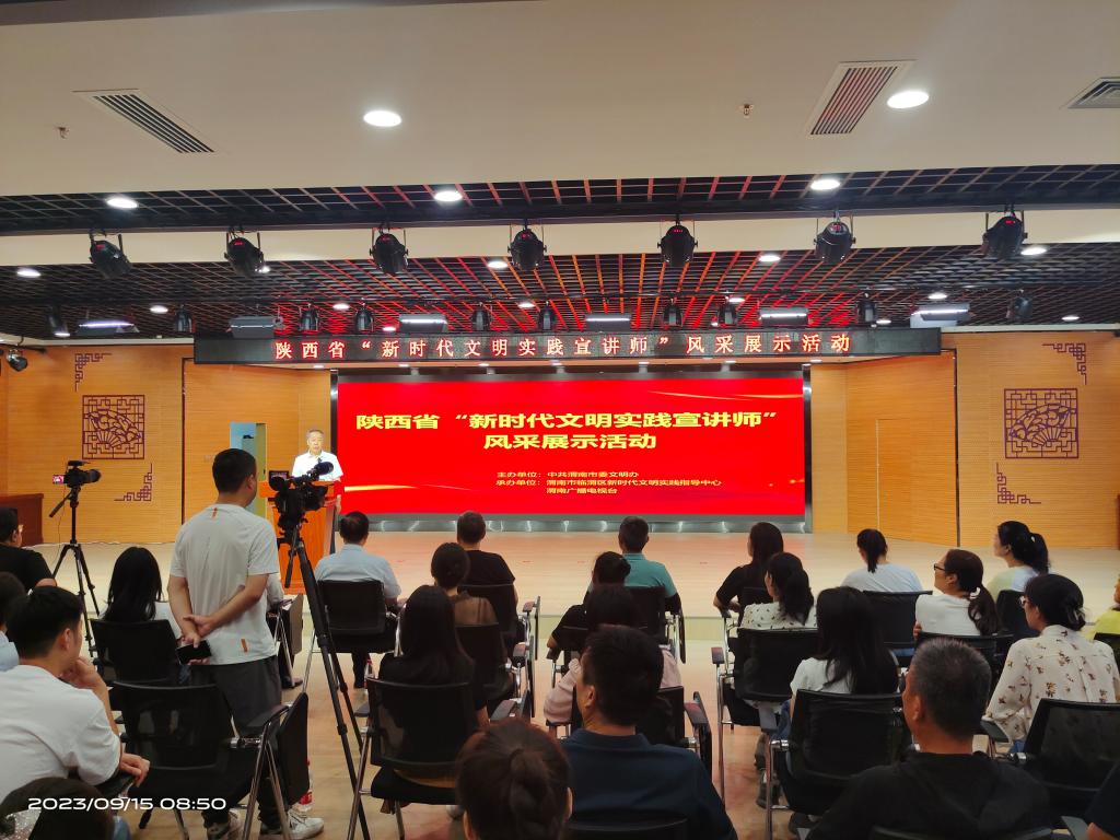 9月15日上午,由中共渭南市委文明办主办的陕西省“新时代文明实践宣讲师”风采展示活动在渭南市临渭区公共文化中心举行。渭南市被聘任的省首批“新时代文明实践宣讲师”中的16名代表现场进行了宣讲风采展示,best365马克思主义学院教师赵兴牛现场参与活动,以“以党的二十大精神为指引推动企业高质量发展”为主题进行了宣讲风采展示,赢得了现场听众的热烈掌声。