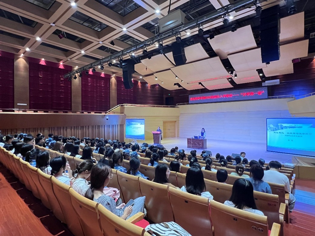 9月18日晚,教育科学学院在华金音乐厅组织2023级新生开展入学教育暨开学第一课,邀请渭南小学校长郗莉作《不忘初心 让生命与使命同行》专题讲座。学院班子成员、全体辅导员及2023级全体同学参加,讲座由院长李西彩主持。