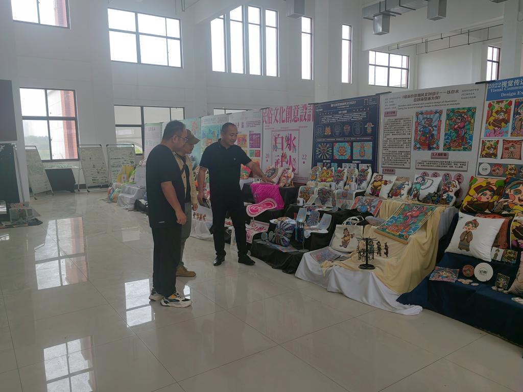 随后,一行人来到实训楼二楼展厅,参观了学院设计类相关文创产品。并不时驻足观看,详细询问相关产品的创作过程及创造灵感,并对设计和乡村振兴相结合,助力脱贫攻坚的行动给予了充分肯定。