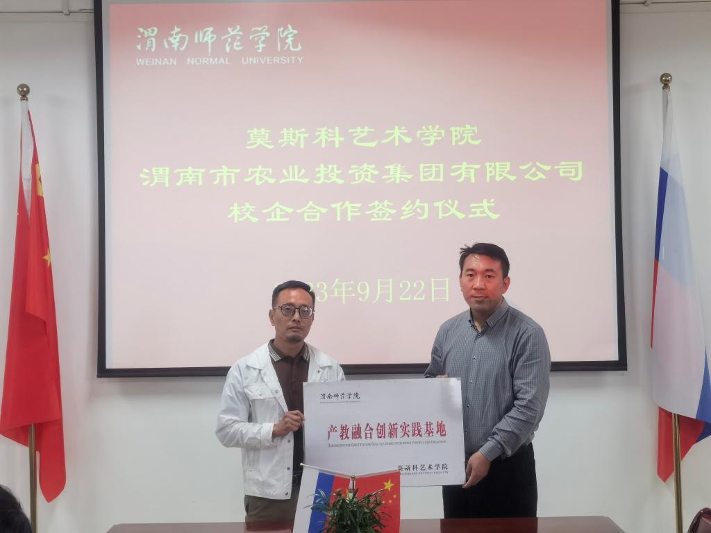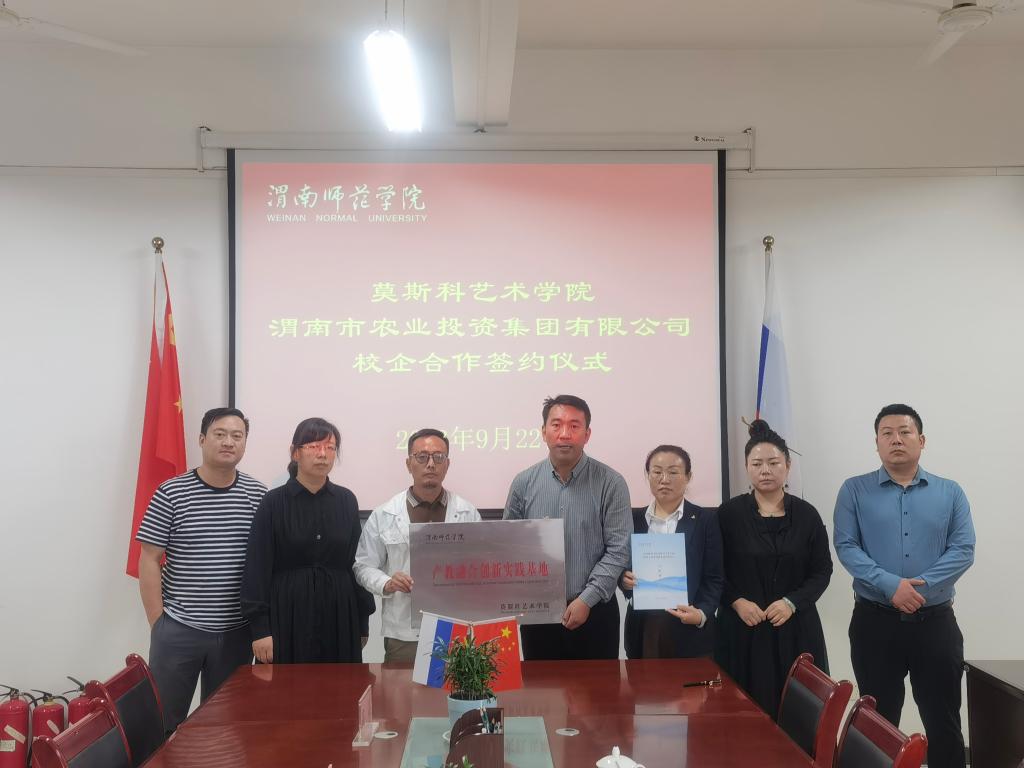 9月22日上午,莫斯科艺术学院与渭南市农业投资集团有限公司,共同商榷产教研融合创新实践基地事宜,签订了双方合作协议书并进行了授牌仪式。参加签约仪式会议的有莫斯科艺术学院副院长梁卫民、高红菊,渭南农投乡村振兴产业开发有限公司总经理侯坤以及双方相关人员。