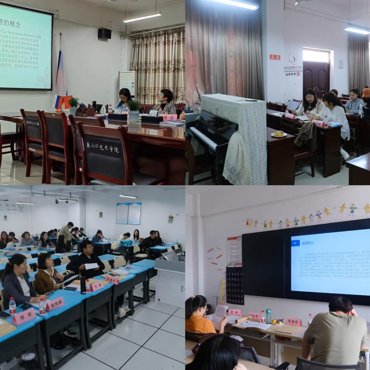 本次开题答辩会分十三个小组进行,其中音乐学专业四组,美术学专业五组,学前教育专业四组,每组由三到五名教师作为答辩评委。开题答辩按照学生汇报、指导教师提问、学生回答、集体评议、意见反馈的程序顺利有序进行。