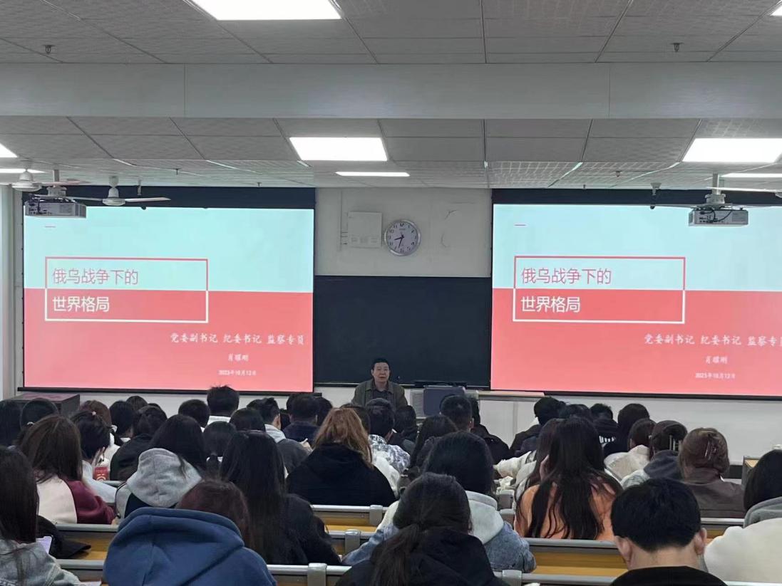 10月12日上午,校党委副书记、纪委书记、监察专员肖耀刚为经济与管理学院富平校区的2023级新生作《俄乌战争下的世界格局》专题讲座,讲座由经济与管理学院院长李富荣主持。