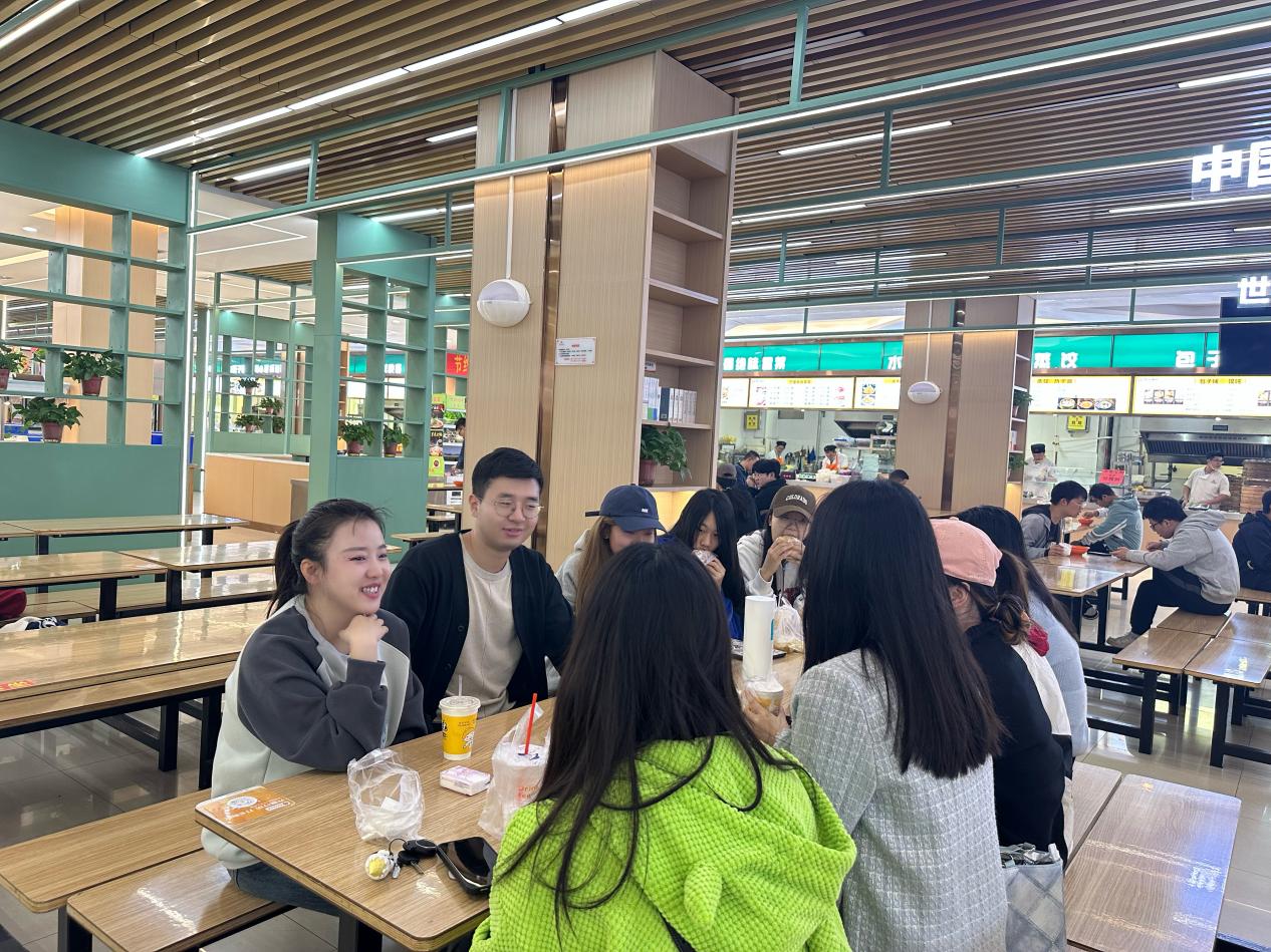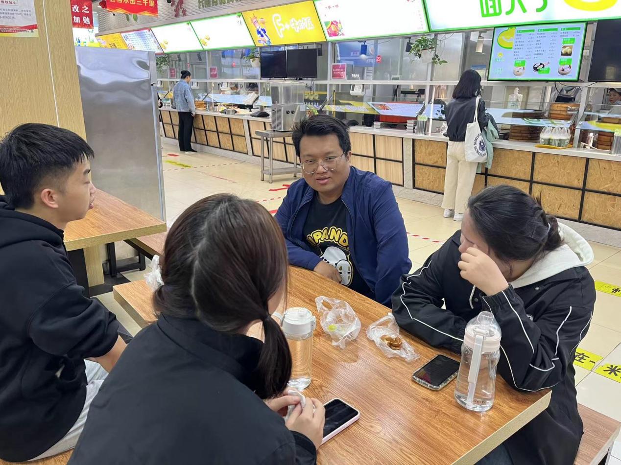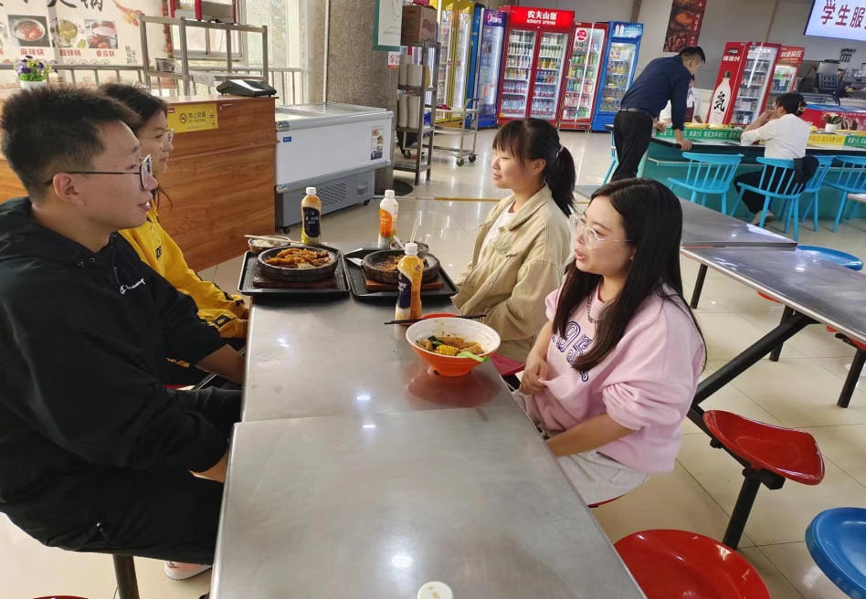 就餐过程中,辅导员和同学们深入交谈,全方位了解学生学习、生活、思想动态、职业规划等情况。就学生比较关注的学习、心理、情感等话题与学生全方位、多层次的交流沟通,对学生进行针对性指导,鼓励学生永葆“三气”,争做有理想、有担当、肯奋斗的新时代好青年,珍惜大学时光,提高自身综合素质,发挥自身核心竞争力,积极投身于校园文化建设中,充分实现个人价值。