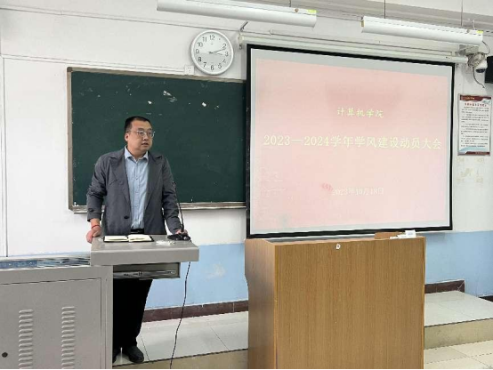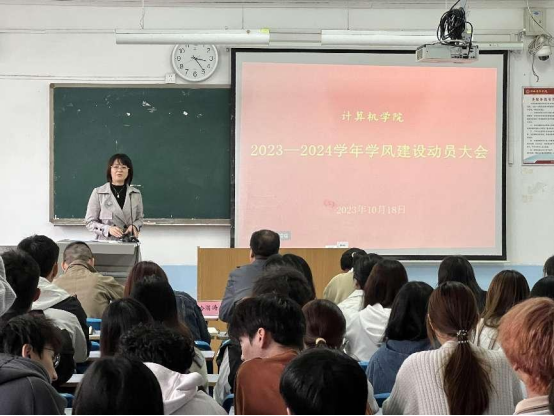 为进一步深入强化推进学风建设,激发学生自主学习的热情,落实立德树人根本任务,营造良好育人氛围,10月18日下午,计算机学院在同心楼5312教室召开2023-2024学年学风建设动员大会暨干部培训会议,学院党政班子,全体专兼职辅导员,班级主要学生干部参加会议,会议由学工办主任李雷玮主持。