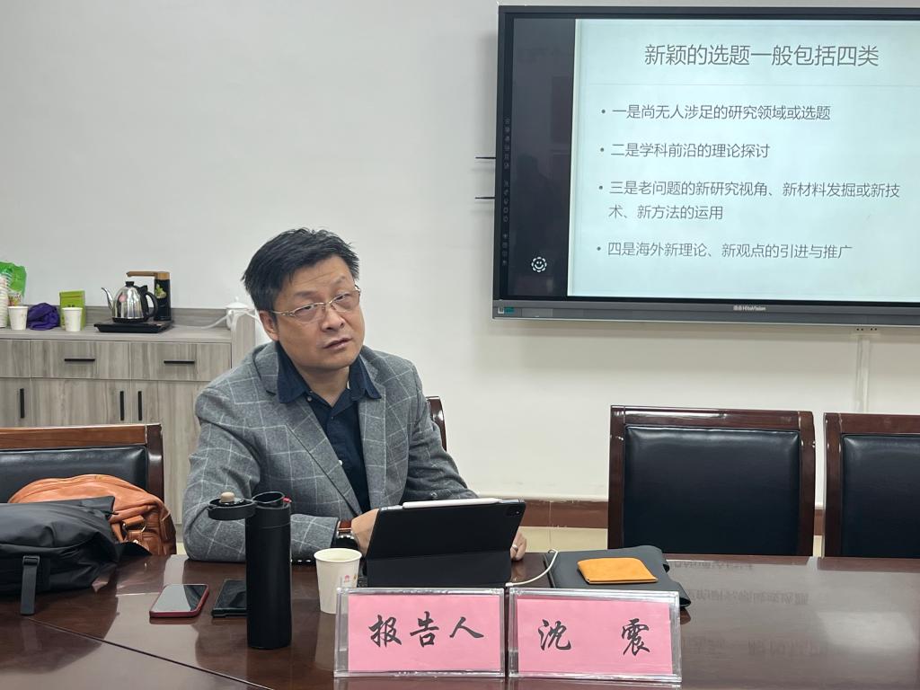 沈震教授梳理了近三年以来国家社科基金思政专项的立项课题,分享了个人的申报经历,他认为思政专项在选题时应以“课题指南”为依据、以学科发展前沿为方向、以研究基础为重点,在话题、问题、主题、标题等方面力求创新,突出新颖。随后强调了文献综述、选题意义、思路方法、创新之处、参考文献等方面存在问题和注意事项。报告结束后,申请此次思政专项课题立项的相关老师就课题申请书中存在的困惑向沈震教授提出问题,沈震教授一一解答。