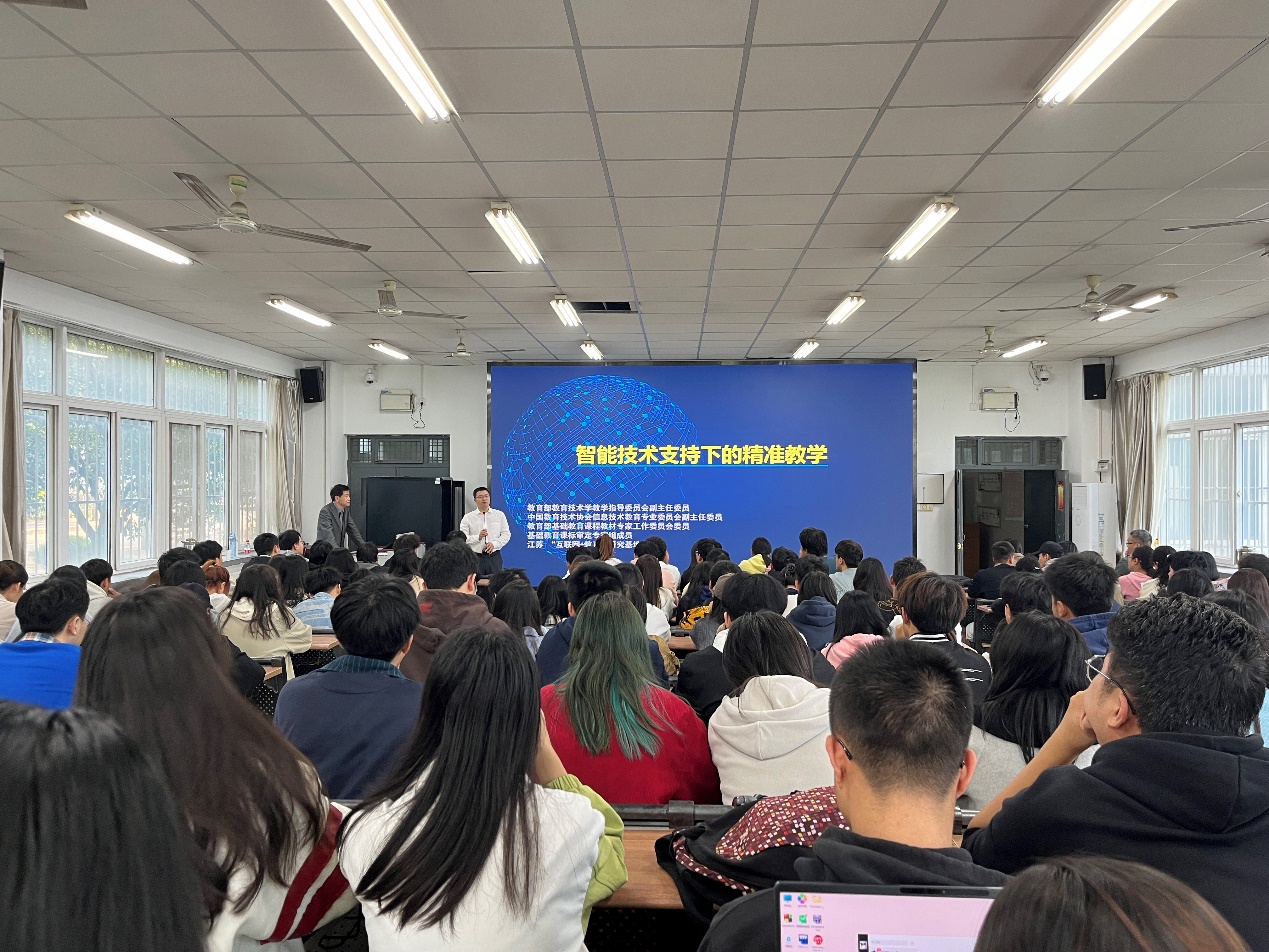 10月25日下午,计算机学院邀请教育部教指委教育技术专业副主任委员、江南大学二级教授,江苏省教学名师,博士生导师,互联网+教育研究基地主任陈明选教授做客红烛讲坛并以《智能技术支持下的精准教学》为主题开展专场学术报告活动。计算机学院教师、师范生及学校部分师生等150余人参加此次报告会。报告会由计算机学院院长杨方琦主持。
