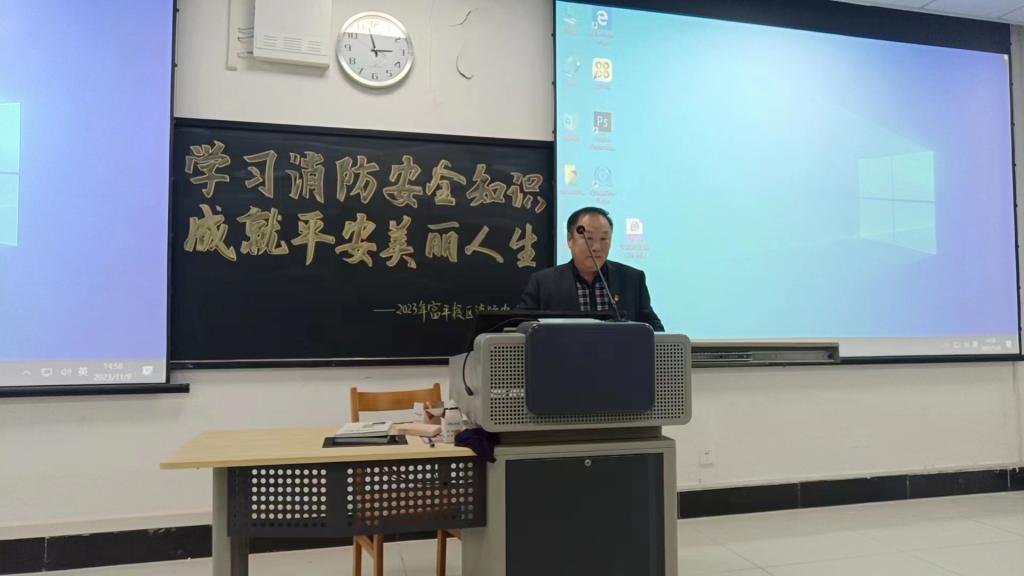 11月9日,学校在富平校区138教学楼举行了消防安全知识报告会。报告会上,保卫处安全顾问田康顺向师生们详细讲述了消防安全事故发生的原因、学校如何做好消防安全管理工作、学生面对火灾如何处理、身处火场时如何逃生自救等方面内容。在逃生疏散和灭火实战演练中,师生们踊跃参与,顺利完成了灭火任务。