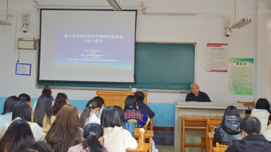 郭九胜结合自己学习、工作、教研经历,分享了他对物理学科特点、中考要求及物理实验教学的思考,报告过程中他围绕着物理学科内涵、物理教师的学识素养、中考命题的指导思想、物理实验考点以及如何有效的进行实验教学,对在校的师范生提出了三点要求:一是多读书、勤思考、善于沟通交流;二是要耐得住寂寞,守得住清贫,经得起诱惑,三是要热爱教育,热爱学生,要有教育情怀。