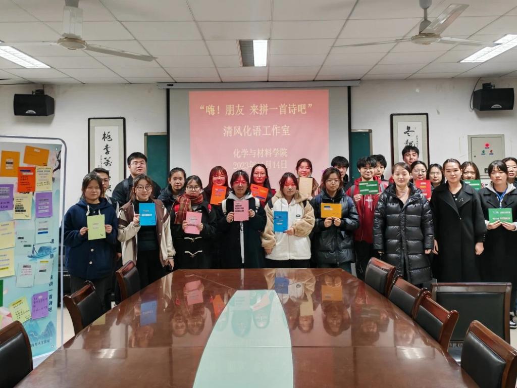 11月14日下午,化学与材料学院“清风化语”思政育人工作室开展“嘿 朋友 来拼一首诗吧”活动。辅导员雷岩、沙丹老师参加了此次活动。